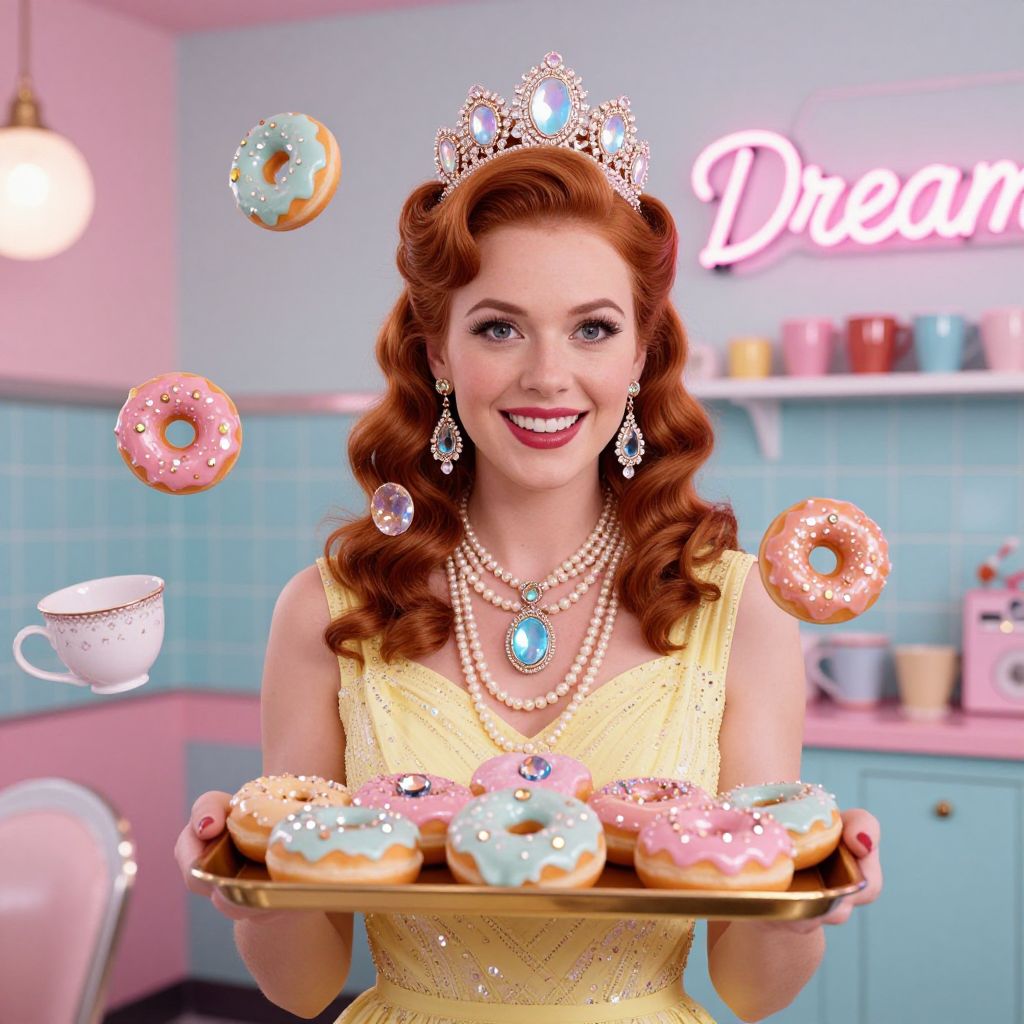 A surreal dreamy low saturation, soft focus, medium shot with a vintage aesthetic of a 20 years old very pretty woman with sweet smile, wavy red hair styled in a 1950s-inspired bouffant, wearing a jeweled crown with opalescent gems, crystal drop earrings with shimmering detail, a multi-strand pearl necklace with a large opalescent blue gem pendant, and a yellow dress with subtle, embedded sequins, many donuts an teacups levitating in hair everywhere, She is holding a gold tray with an assortment of pastel-glazed donuts embedded with diamond reflective glitter and rhinestones with surrealism, The background is a brightly lit 1950s diner setting with a baby blue tiled backsplash, a pink neon sign reading \"Dream\" a shelf with colorful cups, The overall color palette consists of a soft blend of bubblegum pink, baby blue, butter yellow, and mint green, accented with metallic gold, rose gold, silver, and a slight iridescence, The scene utilizes soft, diffused lighting with spotlights creating gentle highlights on the jewelry, the crown, and the emphasising on floating donuts and tea cups around, lorenastyle, retro futuristic clothing style