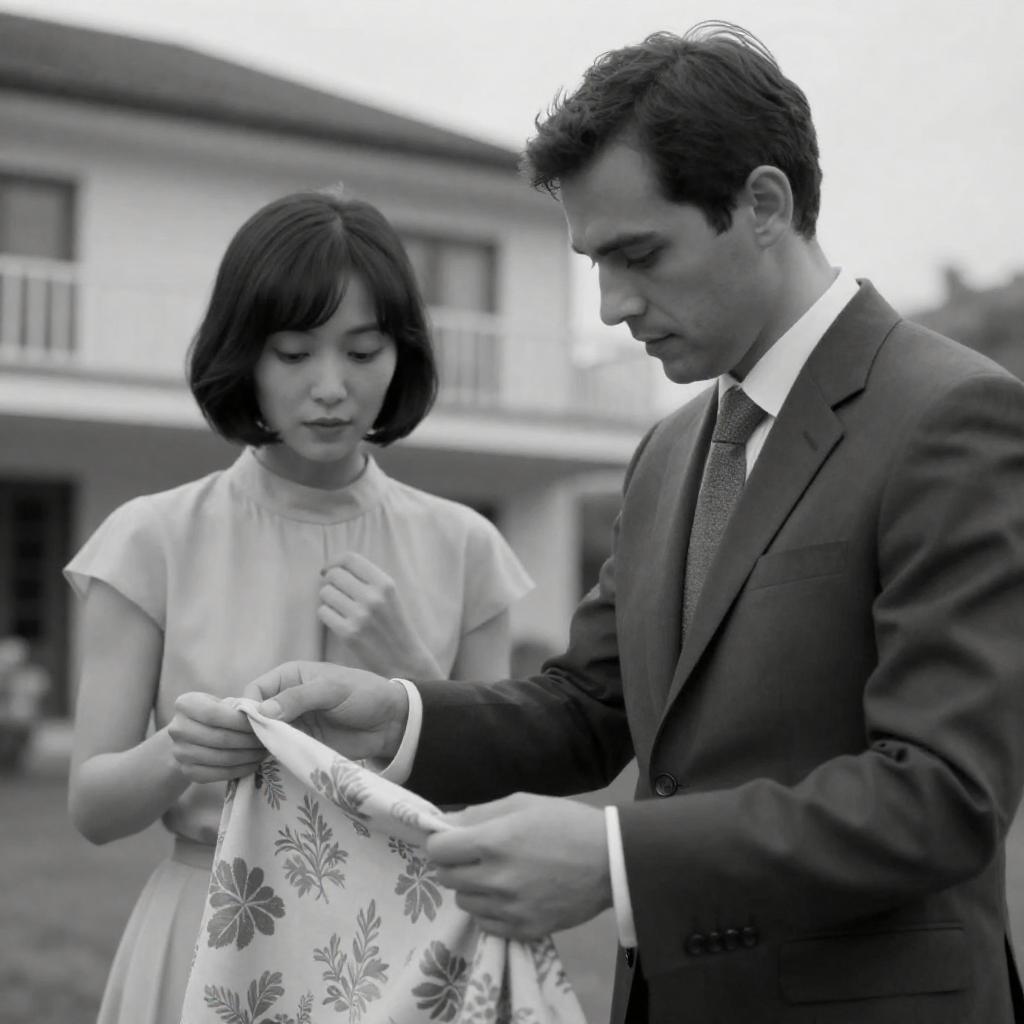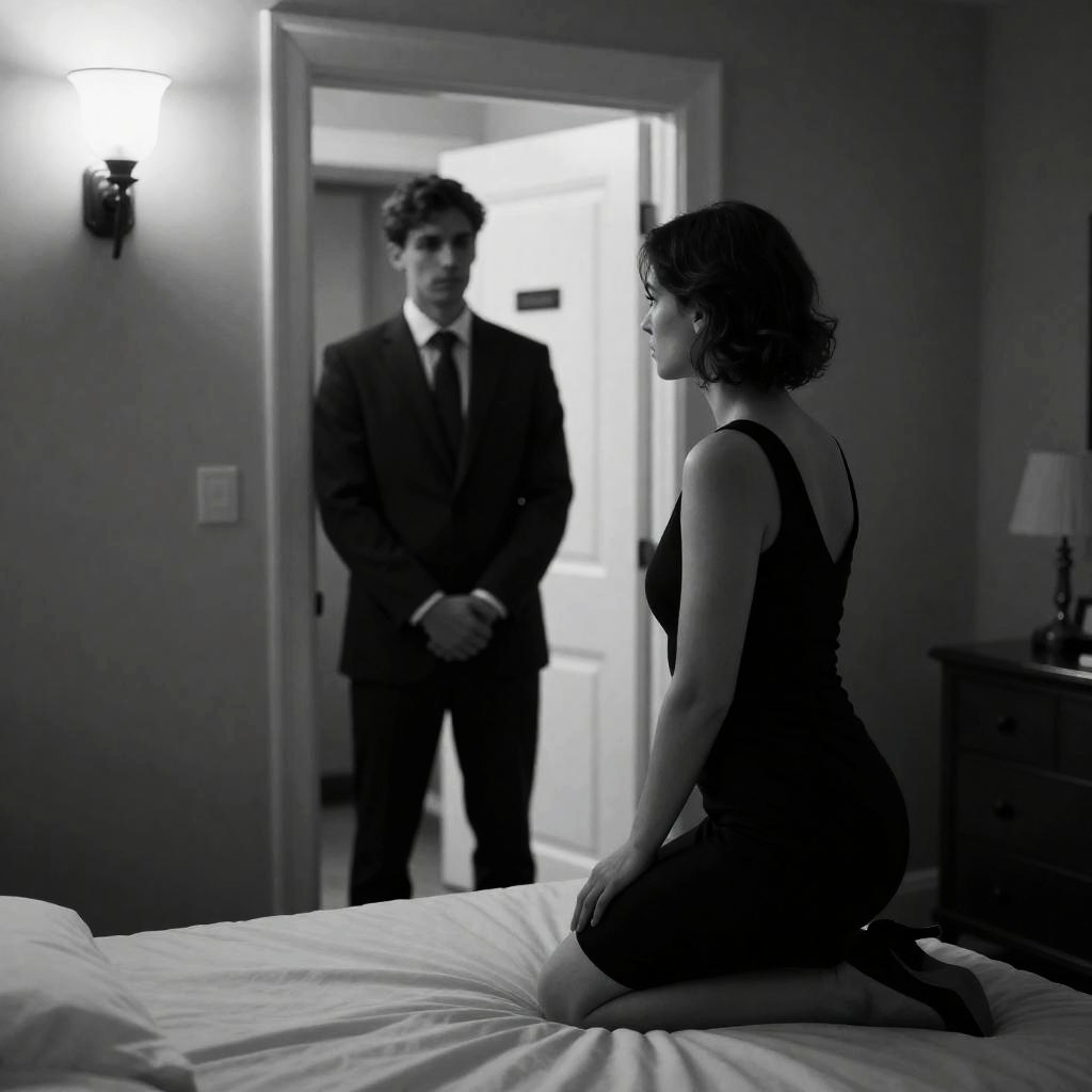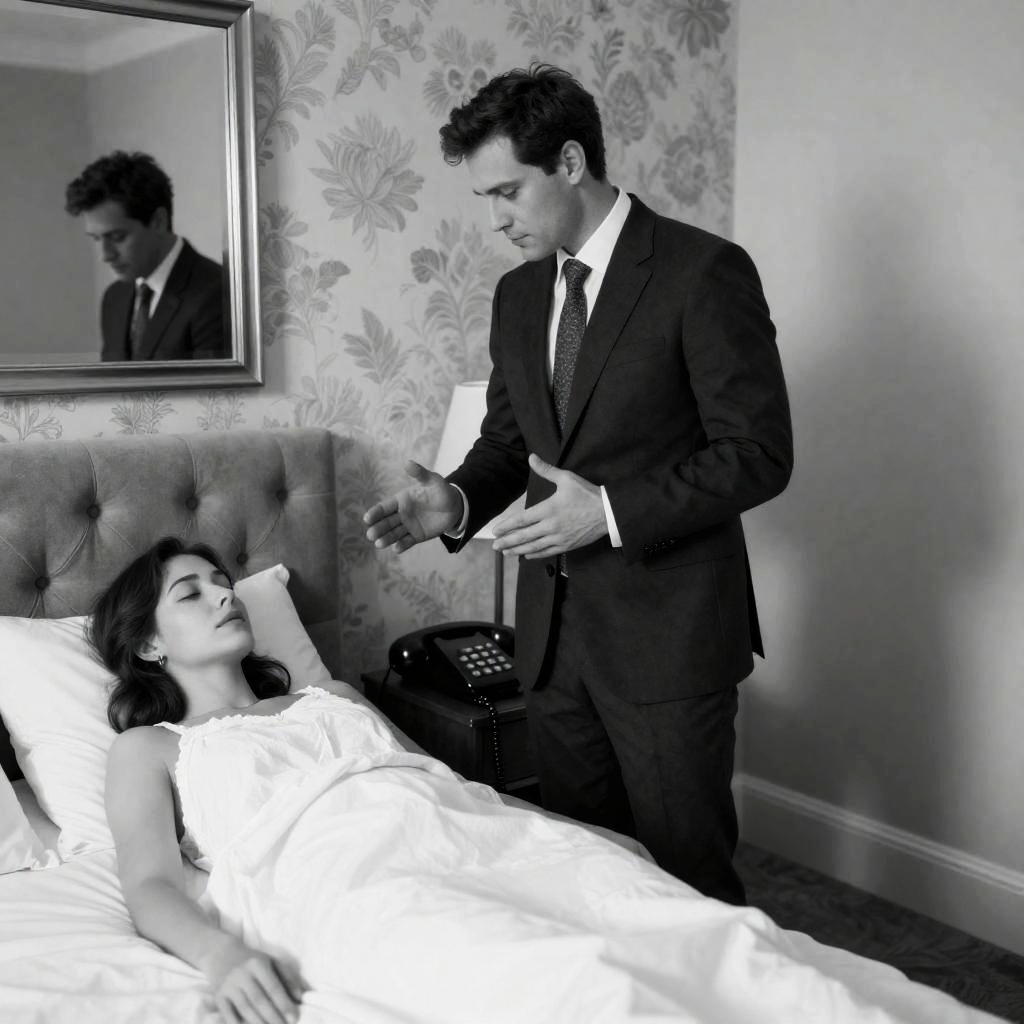 Black and white photograph of a man in a dark suit standing beside a bed with a woman lying down. Tufted headboard, floral wallpaper, mirror reflecting the man's face. Woman in white nightgown, man gesturing with hands. Telephone on bedside table.