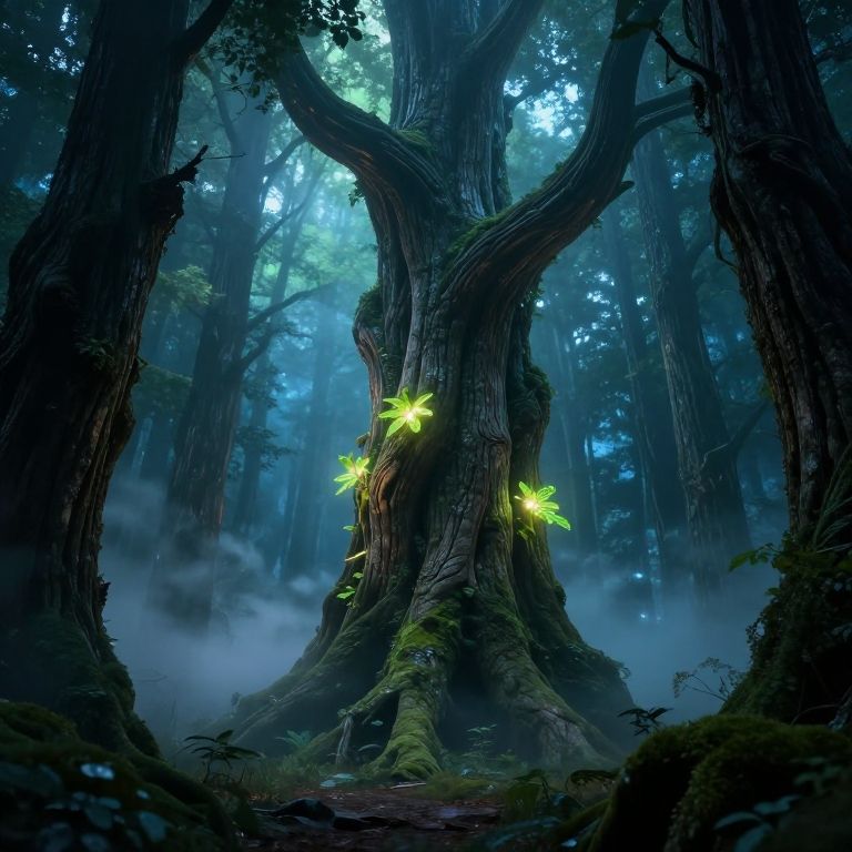 Photograph of a mystical forest scene with glowing crystal lanterns and orbs hanging from a gnarled, moss-covered tree in a dark, enchanting