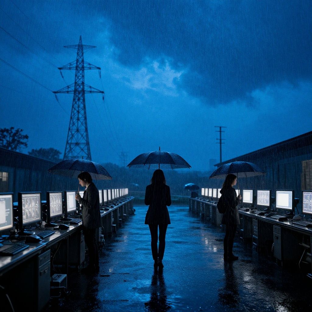 Photograph of a rainy night at a computer lab, three people under umbrellas, blue-lit screens, tall power line tower in background.