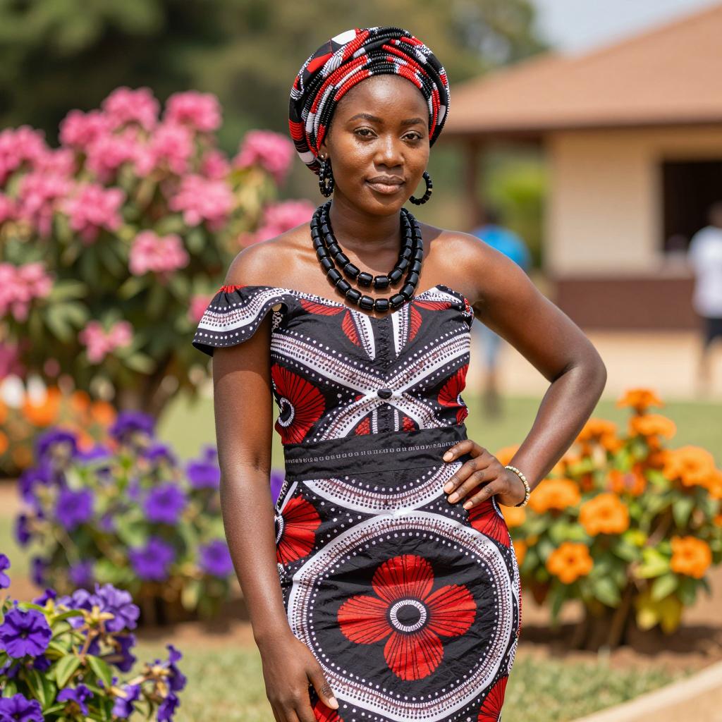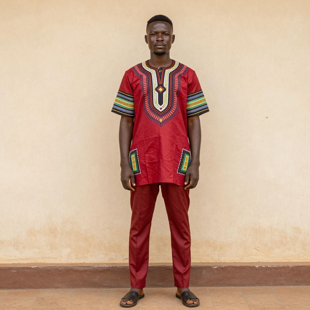 Nigerian attire costume, photograph of African man, medium-dark skin, serious expression, wearing traditional dark blue and red patterned shirt with intricate geometric designs, matching blue headscarf with white and red patterns, standing in narrow alleyway with blurred buildings in background, daytime, clear sky, natural light, shallow depth of field, realistic style, portrait orientation, cultural attire, traditional clothing