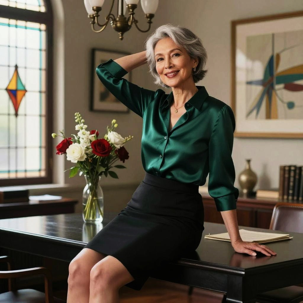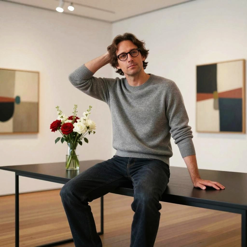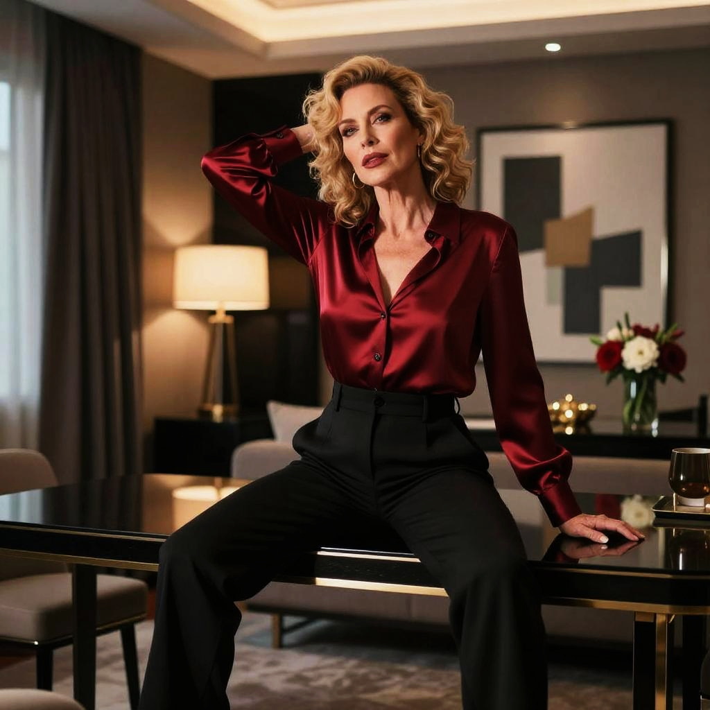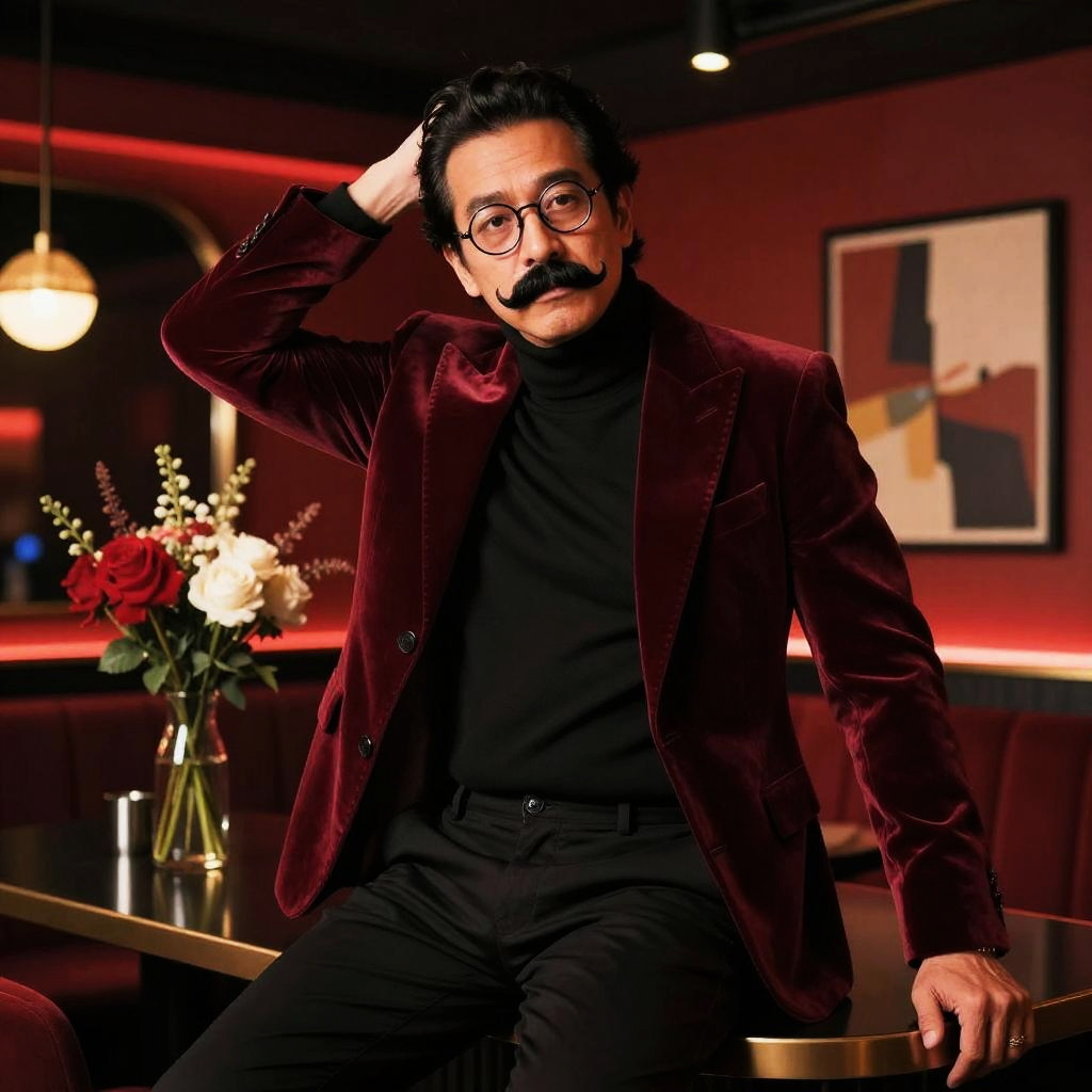 Cinematic editorial photograph of a middle-aged man with bushy black mustache and round glasses, seated on a sleek black table in a retro-inspired jazz club with moody red lighting. Wearing a burgundy velvet blazer over black turtleneck, legs slightly apart in a confident, tasteful pose, one hand behind the head, the other resting on the surface. Background details: modern chandelier, vase of red and white flowers, framed abstract art. Soft rim lighting, shallow depth of field, high detail, non-explicit, refined color grading, subtle film grain, 85mm lens, studio-quality rendering.