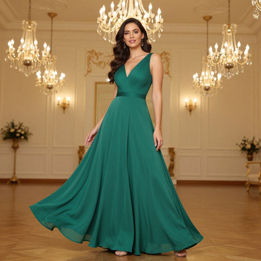 Aurora Inspired Dress, a woman in a green dress standing in a room with chandeliers