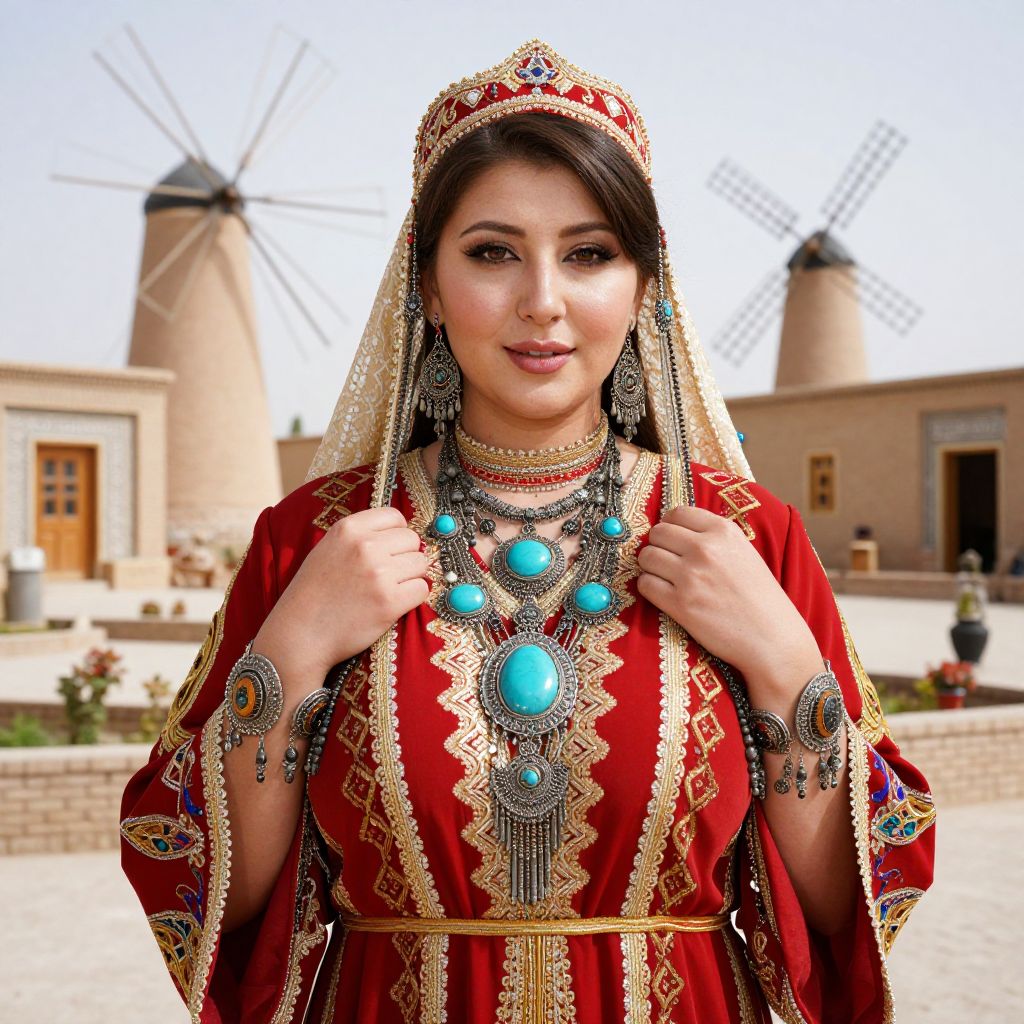 A realistic photograph of a Turkmen traditional woman in her 30s, with warm brown eyes and soft, natural skin, wearing a vibrant red and gold embroidered gown, heavy traditional jewelry including large turquoise pendants, silver necklaces, and elaborate bracelets that drape over her arms and wrists, adorned with geometric patterns, standing in a sunlit courtyard of an ancient Turkmen village in Central Asia, with traditional windmills and desert landscapes in the background, rich in cultural detail and authentic textures.. The woman has big tits and cute face