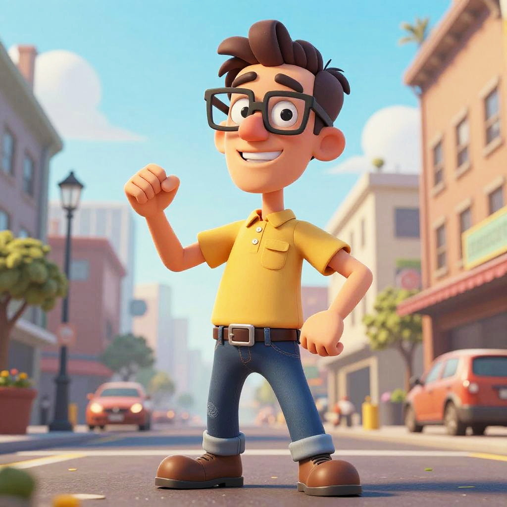 Tall guy with glasses cartoon style, vibrant colors, standing confidently in urban setting, exaggerated features, playful expression, dynamic pose, comic book vibe, detailed background