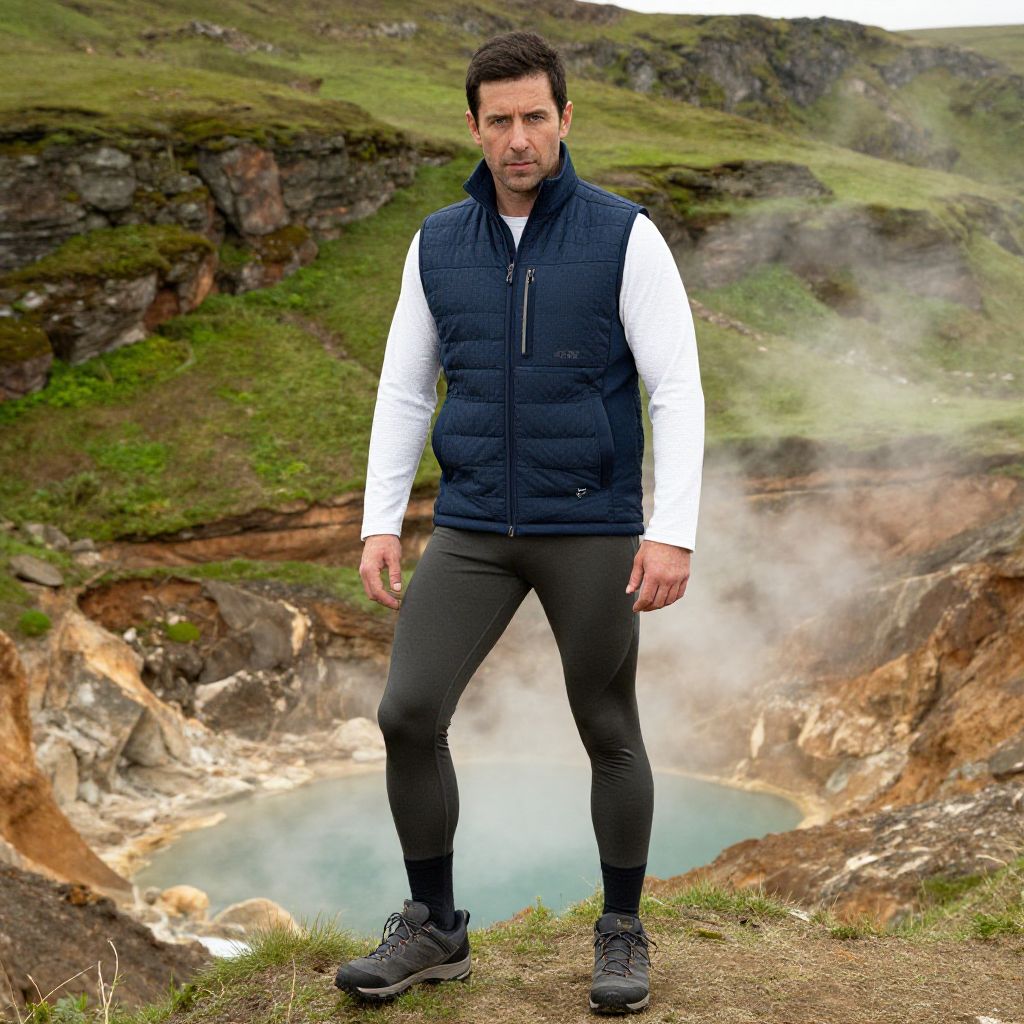 A man, insulated navy blue hiking vest, charcoal thermal leggings, white quick-dry shirt, dark gray trail shoes, compression socks, lush green cliffs, steaming fumaroles, turquoise lagoons, sepia effect, focused expression Man has masculine face and piercing eyes