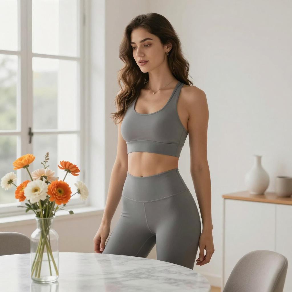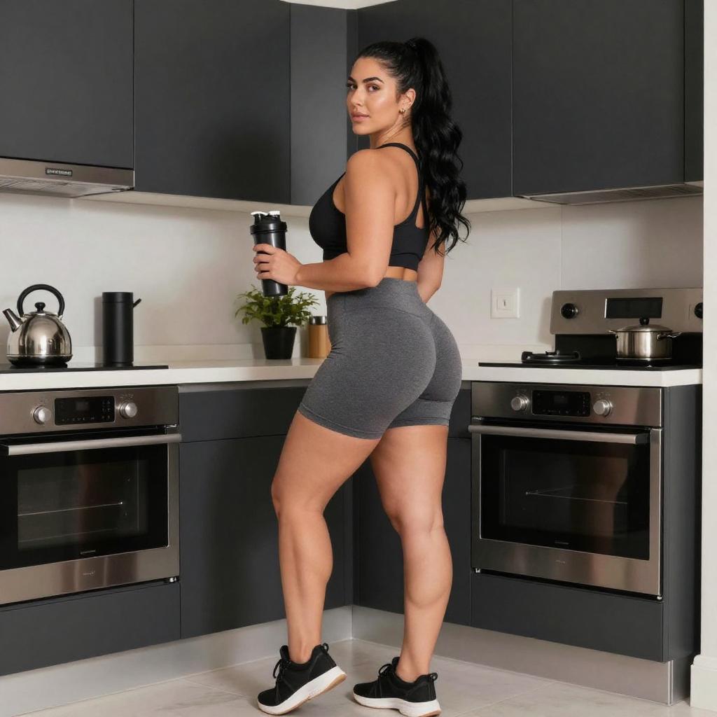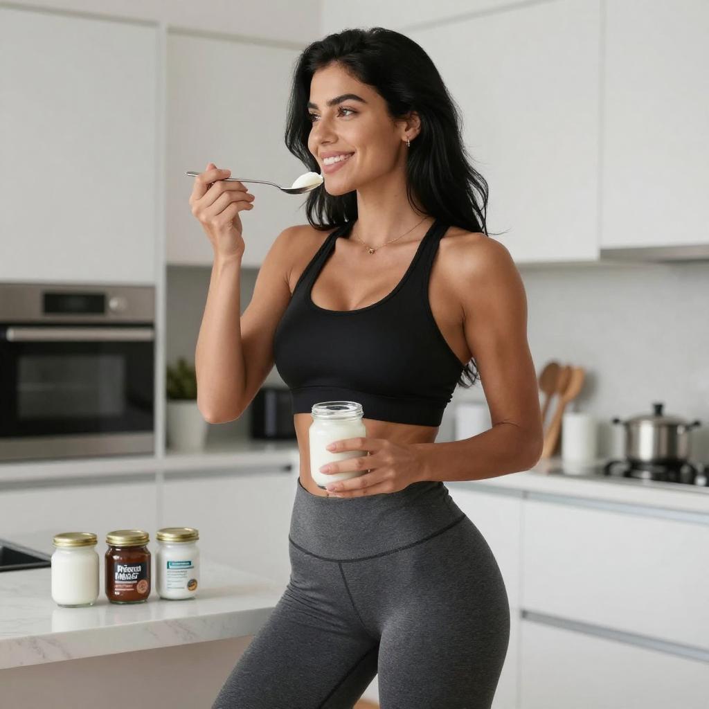 Photograph of a fit, young woman with long black hair, tan skin, and a slim, curvy physique. She wears a black sports bra and tight, gray leggings, smiling while eating yogurt from a spoon. She stands in a modern kitchen, holding a glass jar in her left hand. On the table to her left are several small jars.