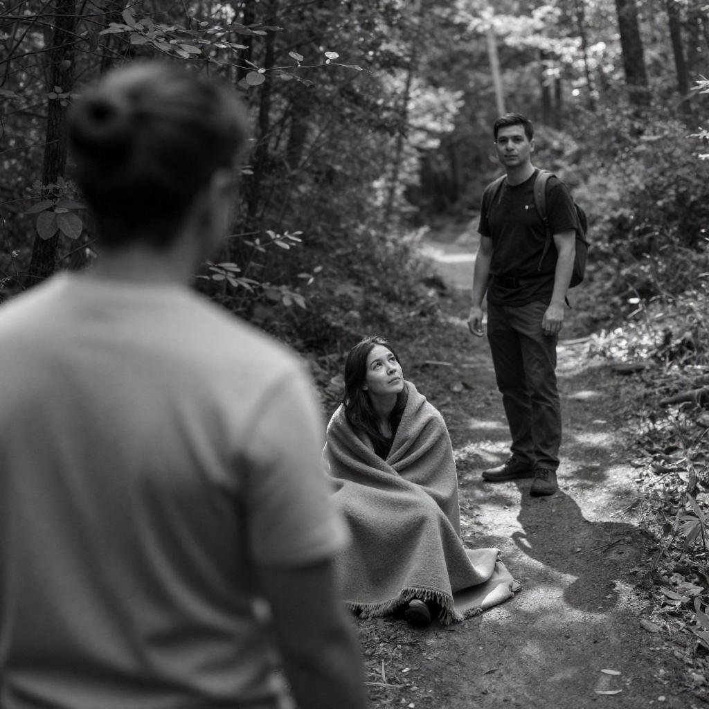 Black and white photograph. Man in casual clothes, striped pants, sneakers, and T-shirt, squatting with hands raised. Woman in dark dress and cardigan, arms crossed, standing beside him. Forest background, rocky ground. Man has short hair, woman has dark hair. Man looks focused, woman looks serious. Both look at each other.