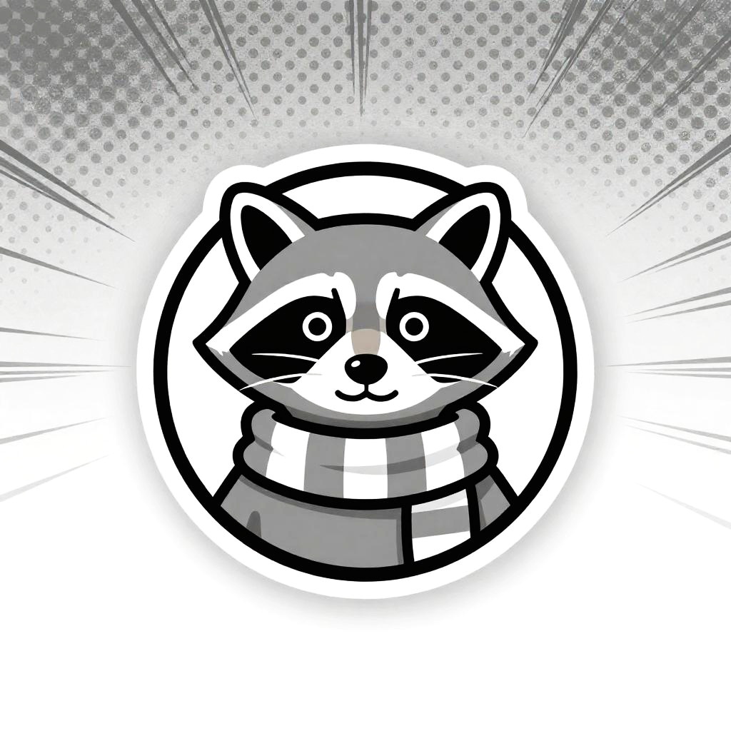 Vintage comic book dot style profile avatar of a cheeky raccoon wearing a striped scarf set against halftone dot sky with descending comic speed lines, bold outlines, crisp vector shapes, playful expression, soft rim light, centered bust, circular crop, minimal background clutter, clean negative space, high contrast, smooth shading, subtle glow, sticker vibe, 1:1 aspect ratio, SDXL, social media icon, ultra sharp
