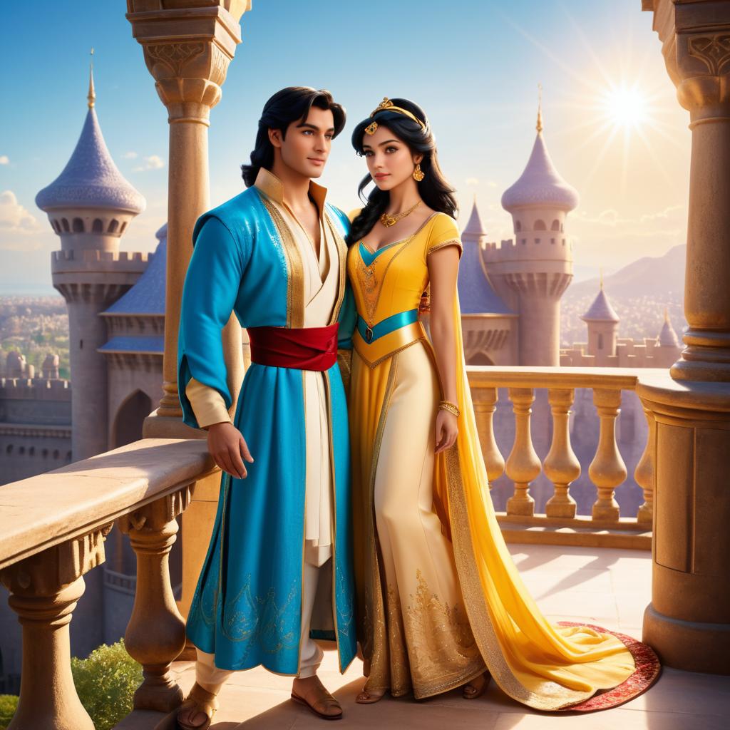 Photo of Dark-haired Jasmine and Aladdin standing on a beautiful castle balcony side by side looking at the camera, daylight, it's sunny, beautifully dressed in elegant robes, daylight.