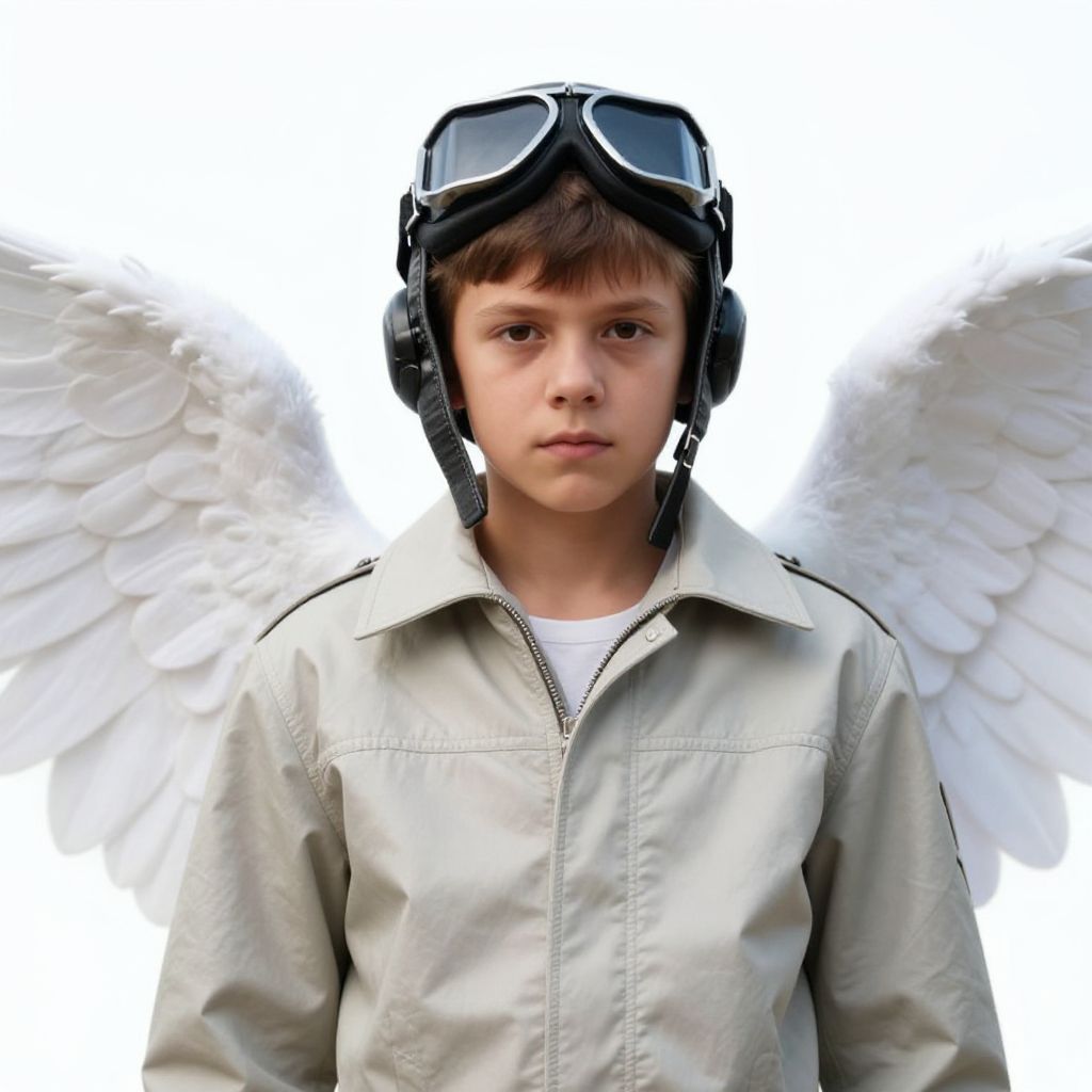 Wing pilot costume man, 1boy, goggles, wings, male focus, solo, realistic, looking at viewer, angel wings, goggles on head, jacket, upper body, white wings