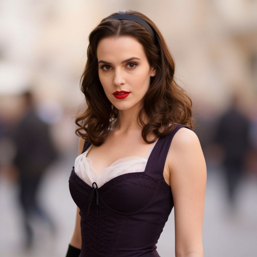 Morticia costume, 1girl, solo, blurry background, realistic, brown hair, blurry, looking at viewer, red lips, hairband, upper body, makeup, dress