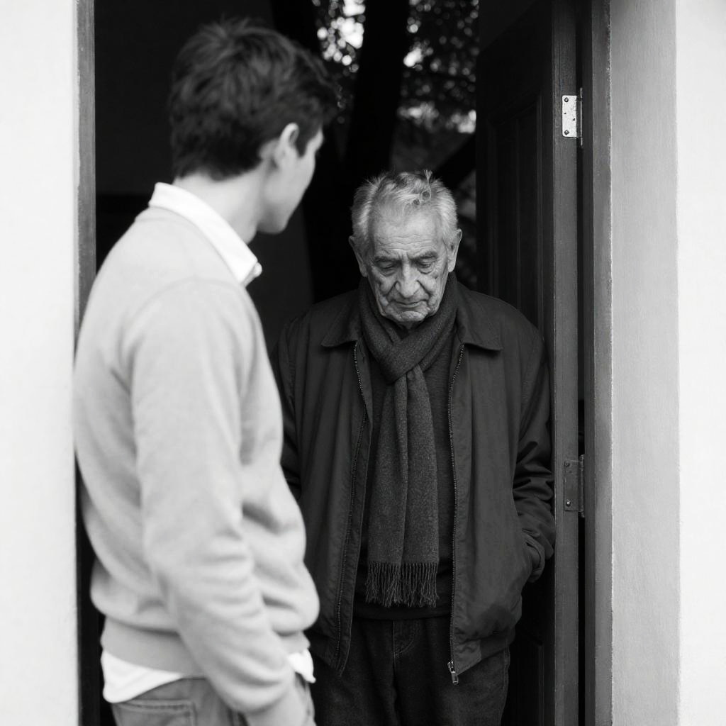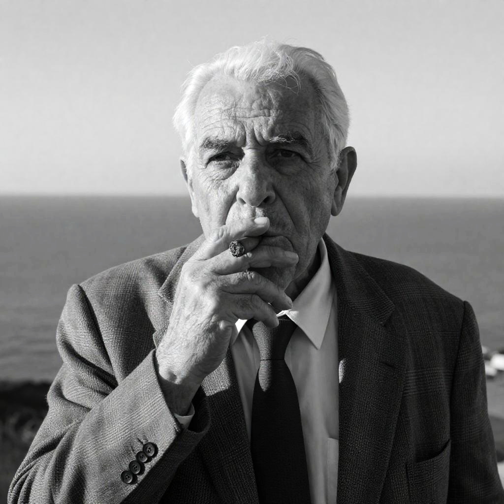 Black-and-white photograph of an elderly man with white, curly hair and a black coat. He has a gaunt face with pronounced cheekbones, a small black mark on his left cheek, and a pipe in his mouth. Blurred, dimly lit background. Man looks to the left.