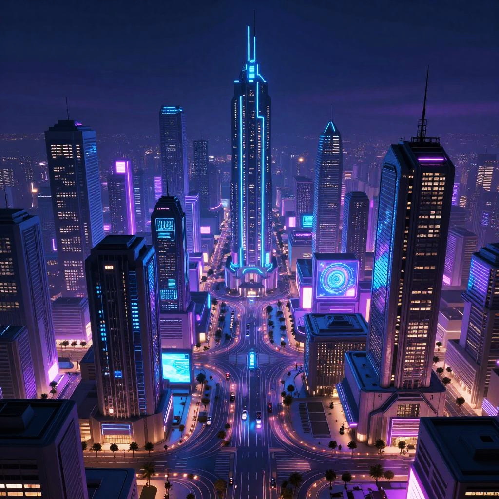 Sci-fi city map featuring glowing neon streets and towering futuristic skyscrapers, intricate road networks, holographic signs, vibrant blues and purples, cyberpunk aesthetic