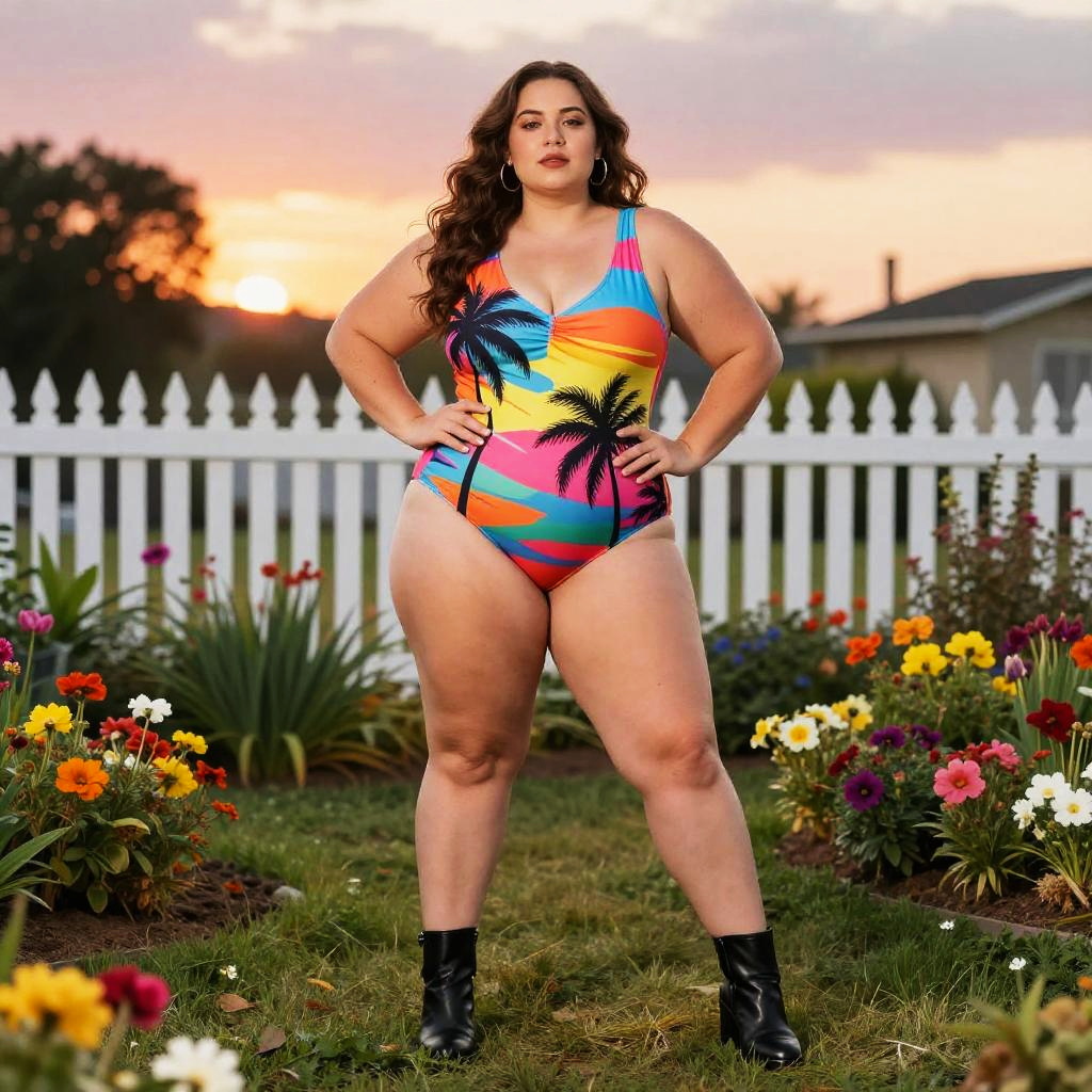 Photograph of a curvy, dark-haired woman with large hoop earrings, wearing a white lace top and black floral pants, standing in a vibrant,