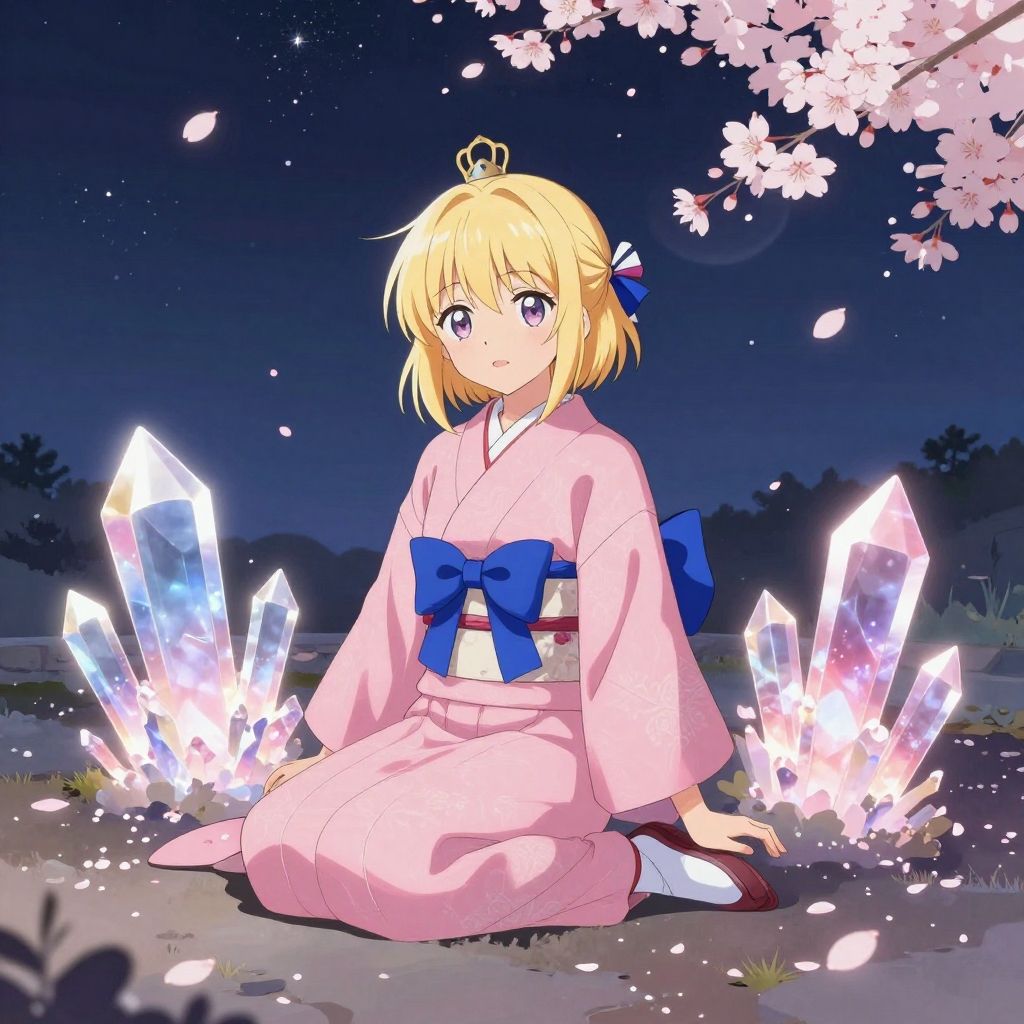 Digital illustration of an anime-style blonde girl wearing a pink kimono with a blue bow and a crown, sitting on the ground surrounded by glowing crystal formations and cherry blossom petals at night. The scene features a starry sky and falling petals, emphasizing a serene, magical atmosphere.