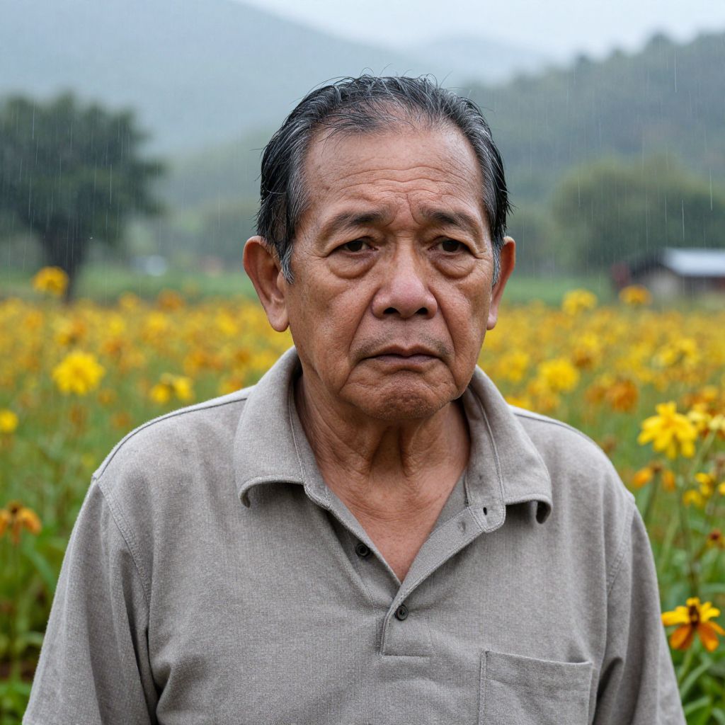 Hyperrealistic portrait of a sad philippine old man in a scenic environment, bright flowers, rain, by beksinski zdzislaw, buchholz, quint, yoro sean, christensen james c.,