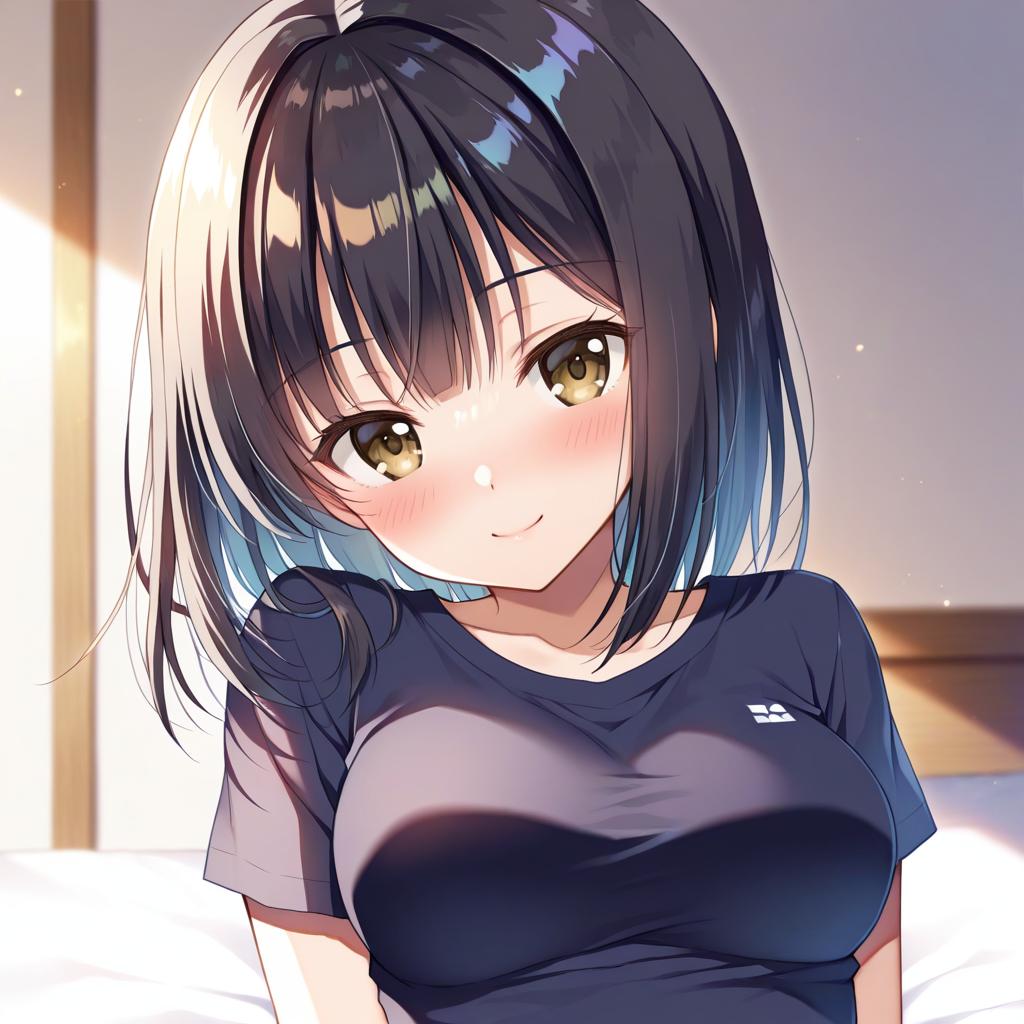 Close-up of an anime-style girl with medium-length black hair featuring light blue highlights. She has brown eyes and is wearing a dark blue fitted T-shirt. The character has a gentle smile and slightly blushed cheeks, set in a softly lit indoor environment.