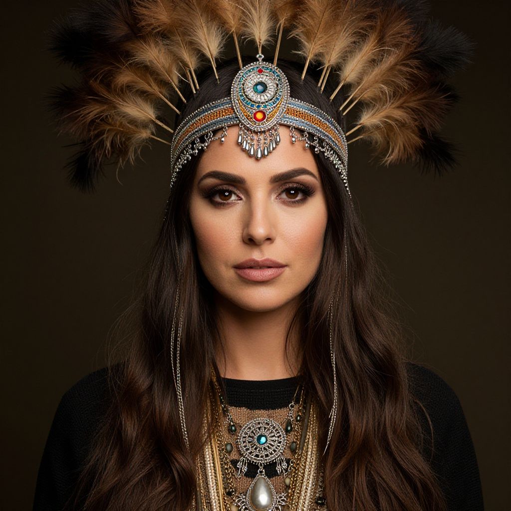 "Valhalla Honey Woman, a woman with long hair wearing a headdress and a necklace"