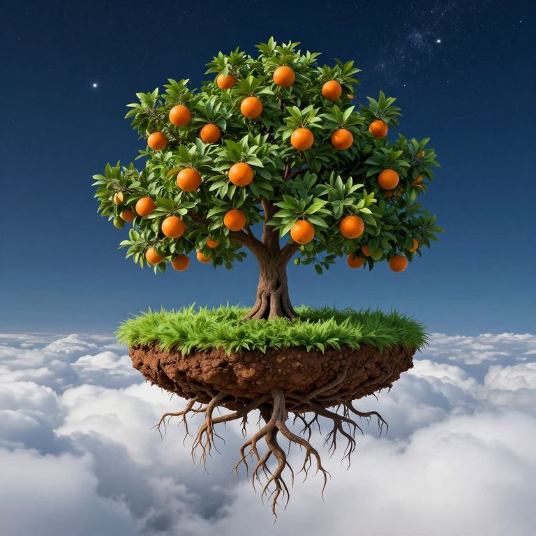 A vibrant orange tree laden with ripe fruits floats serenely above a lush green patch of soil, its intricate root system sprawling downward into billowing white clouds beneath a star-studded night sky.