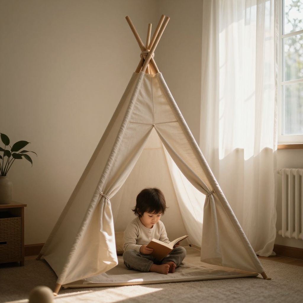 Photograph of a young child with short brown hair, wearing a white long-sleeve shirt and gray pants, sitting cross-legged inside a small, cream-colored canvas teepee tent. The tent has wooden poles at the top and is set on a beige carpet. The child is intently reading a book, bathed in soft sunlight streaming through a nearby window with white curtains. To the left, there is a small wicker basket with a potted plant. The room has light beige walls and a wooden floor, creating a warm, cozy atmosphere.