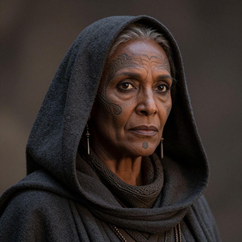An older, dark-skinned woman with intricate facial tattoos and a hooded cloak, reminiscent of the Bene Gesserit from Dune.