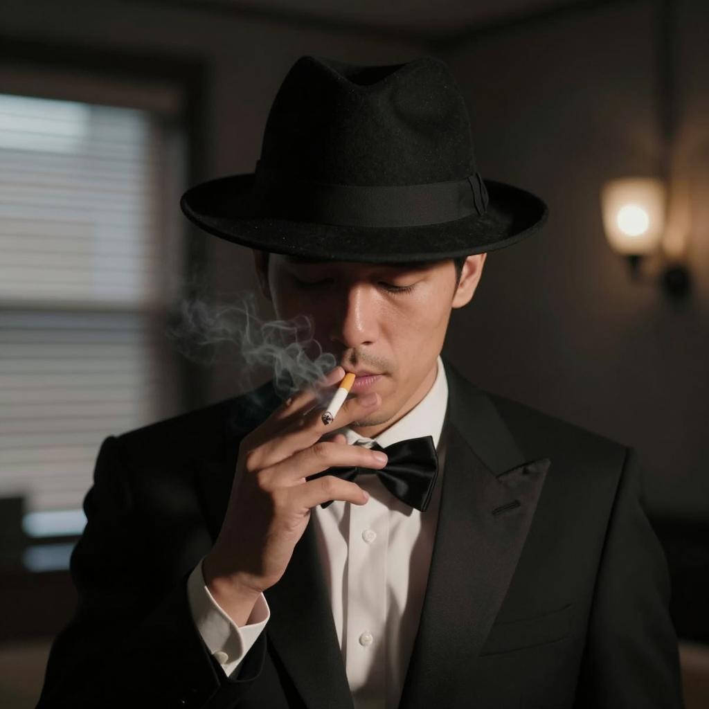 Photograph of a man with dark hair, wearing a black suit, white shirt, and red patterned tie, holding a cigarette to his right ear. He has a mischievous smile, light skin, and thick eyebrows. Background is dark brown and ured. Smoke from the cigarette curls upwards. Man's head is tilted slightly to the left.