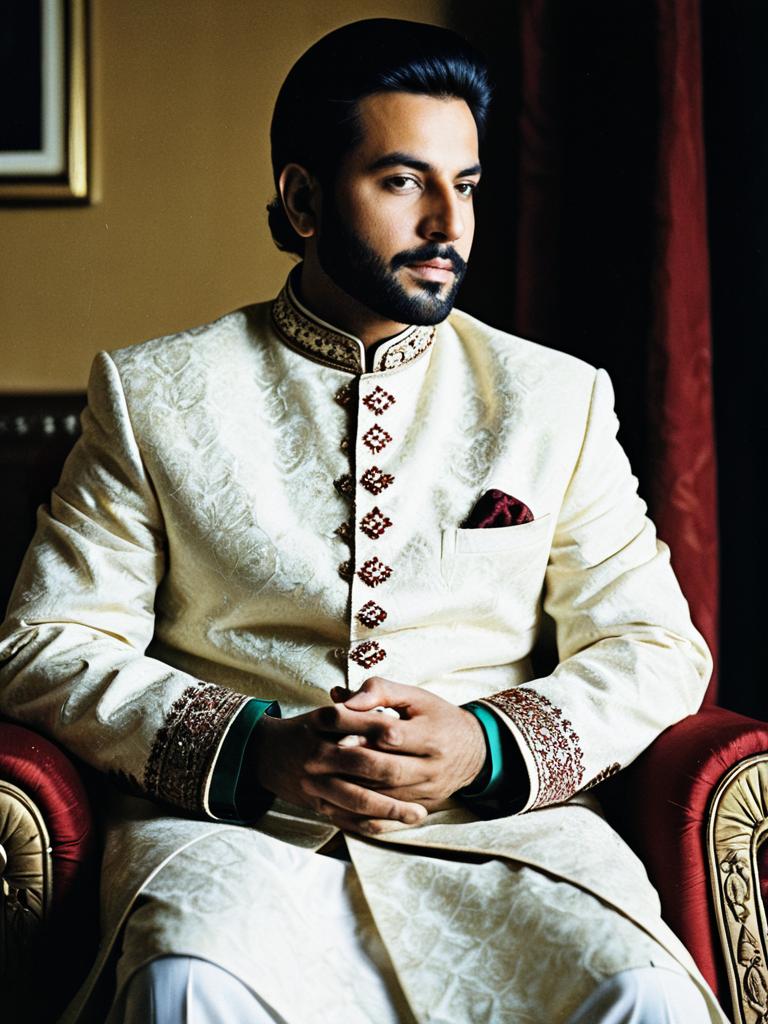 Man in Sherwani Shalwar, photorealistic outdoor portrait at golden hour