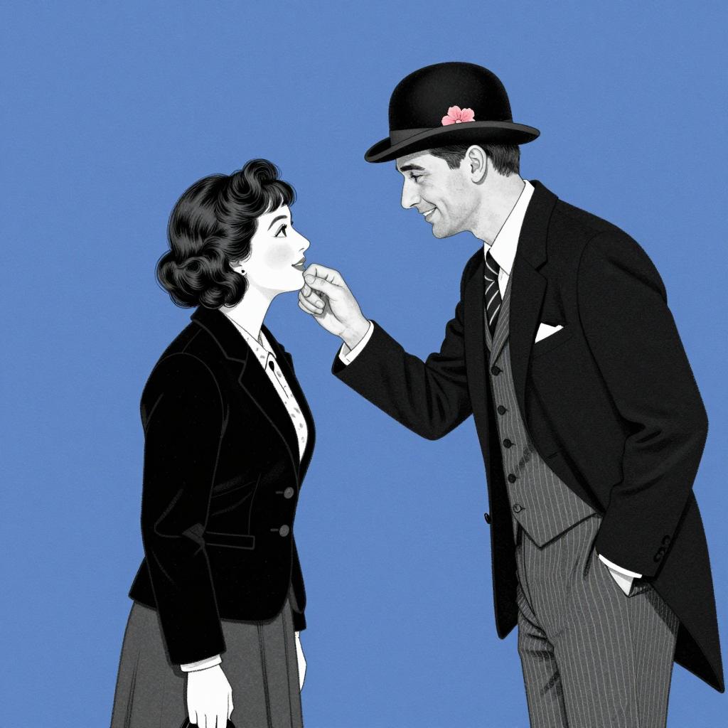 Black-and-white illustration with blue background. Man in black suit, bowler hat, and pink flower bends forward, smiling. Woman with short, wavy hair, black jacket, and patterned blouse looks up at him. Man's hand near woman's face. Both standing.