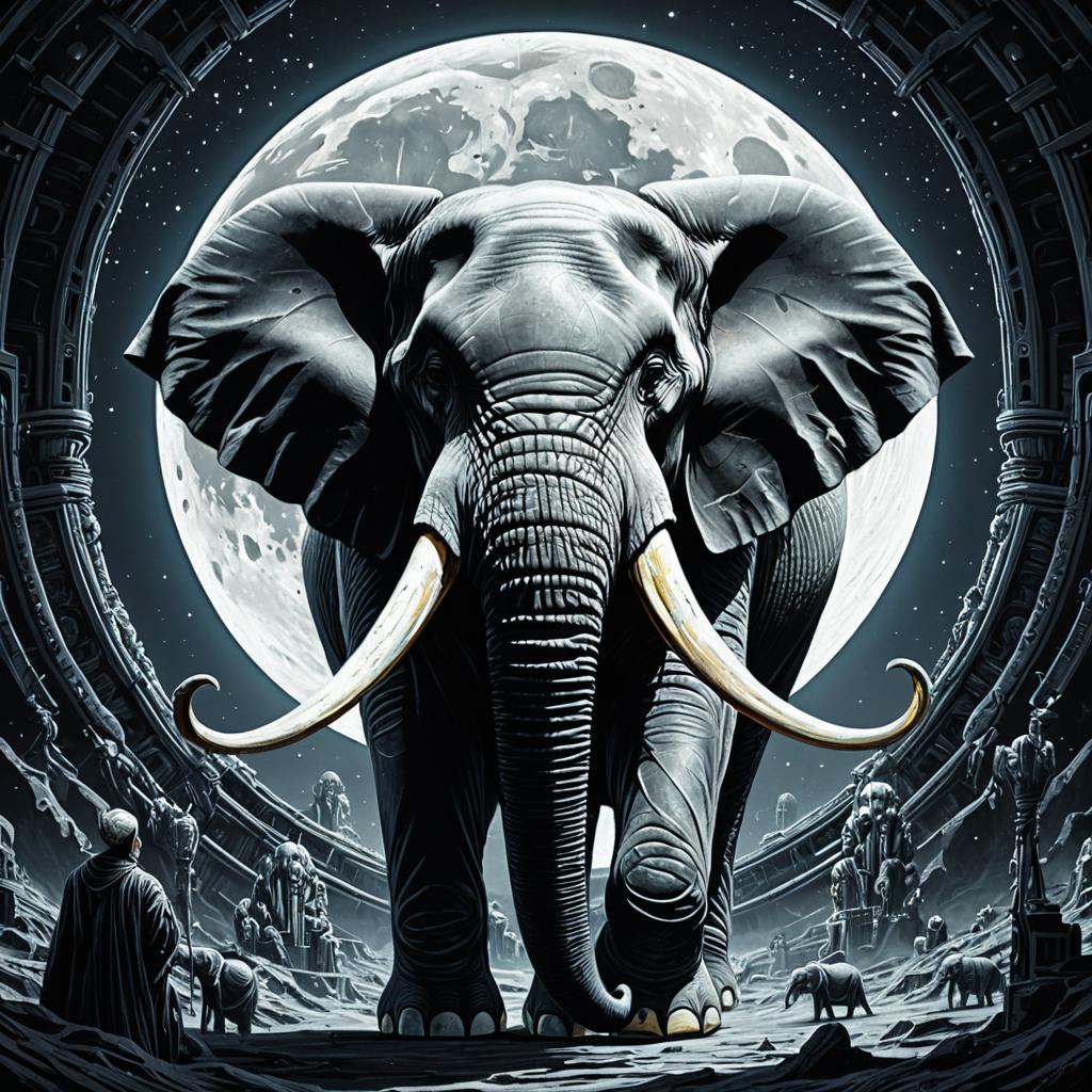 An elephant painting on a giant canvas, moon in the background, intricate, elegant, highly detailed, digital painting, artstation, concept art, smooth, sharp focus, illustration, art by Beeple, Yoshitaka Amano, H.R. Giger