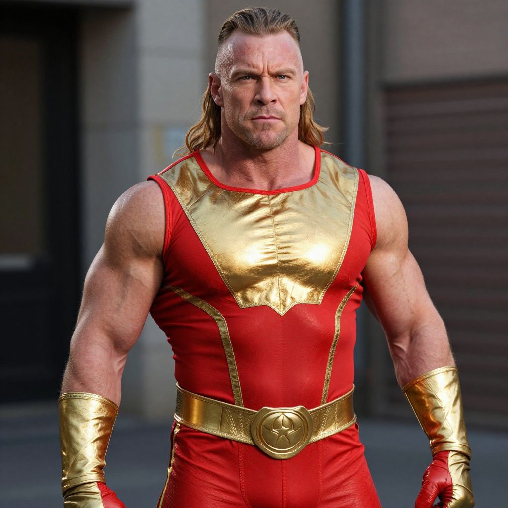 Photograph of a muscular man with long, blonde hair, wearing a red and gold superhero costume with gold gloves and belt.