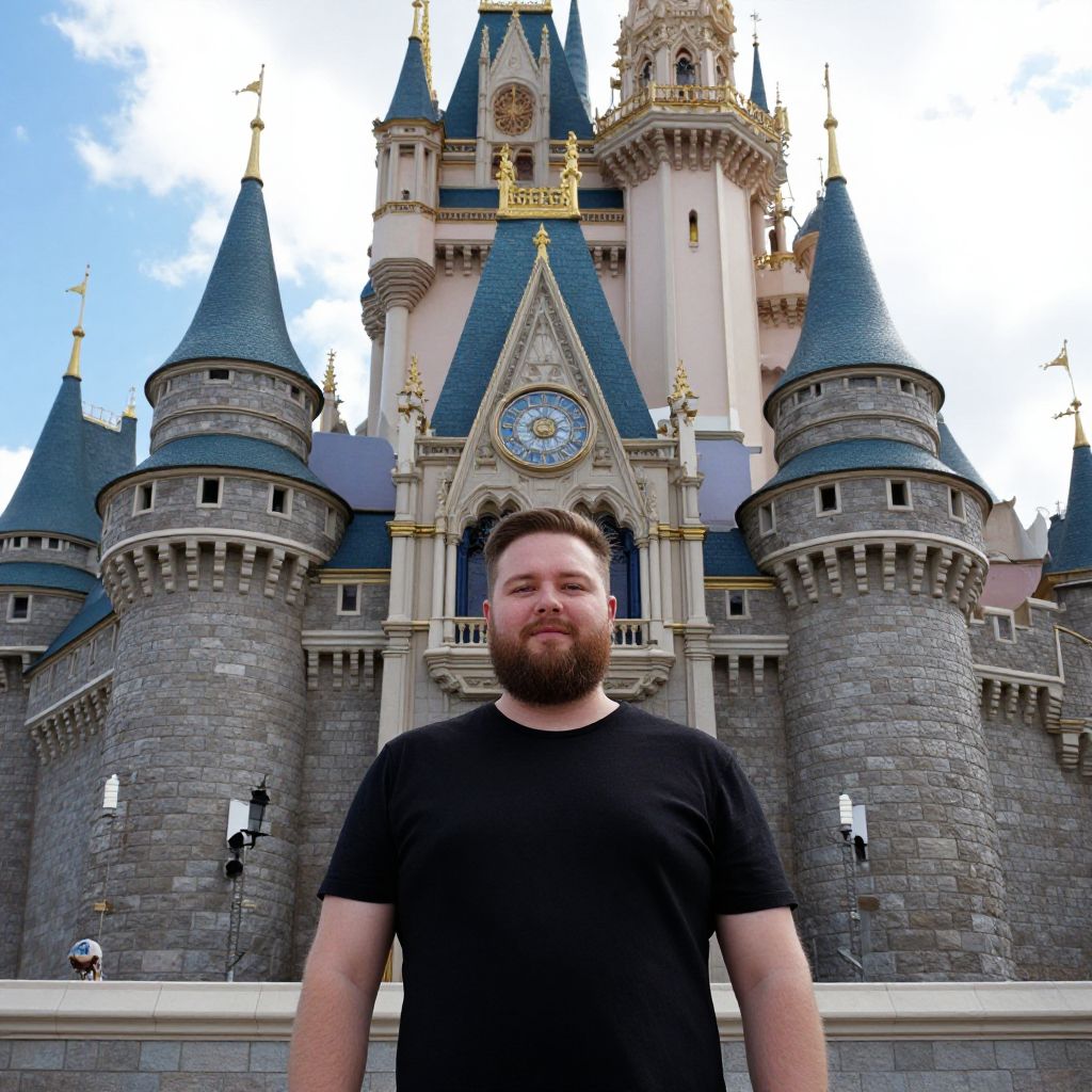 Photograph of a bearded man with a medium build, short brown hair, and a black t-shirt standing in front of a grand, fairy-tale castle. The castle has multiple grey stone towers with blue slate roofs, golden accents, and a large clock centered at the top. The sky above is partly cloudy, adding a bright contrast to the castle's colors.