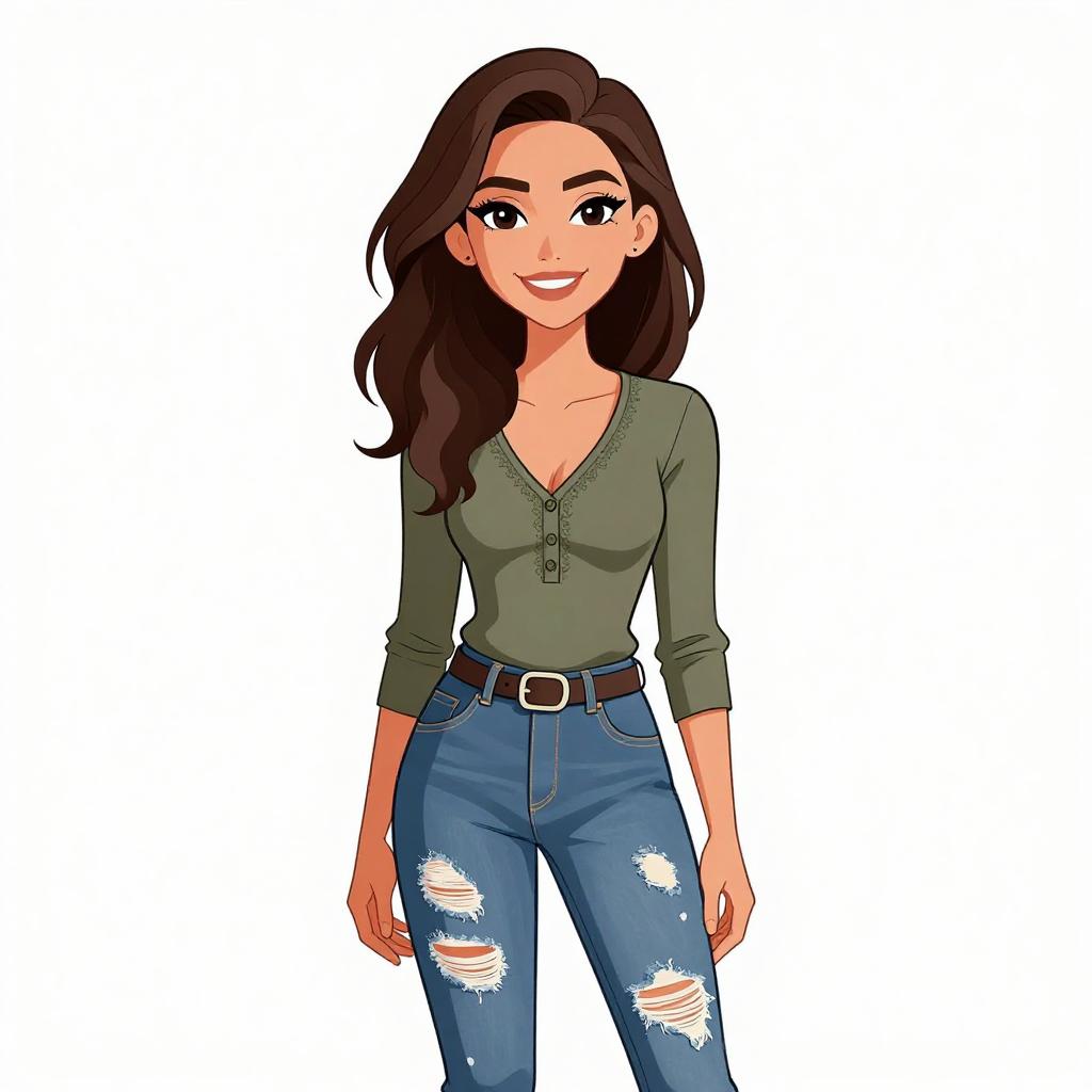 Woman with pretty face and pretty hair. smiling Woman, casual, olive green henley top with lace detailing on placket, long sleeves, mid rise distressed blue jeans with ripped knee, relaxed fit, dark brown belt with a simple buckle. --sref 1467