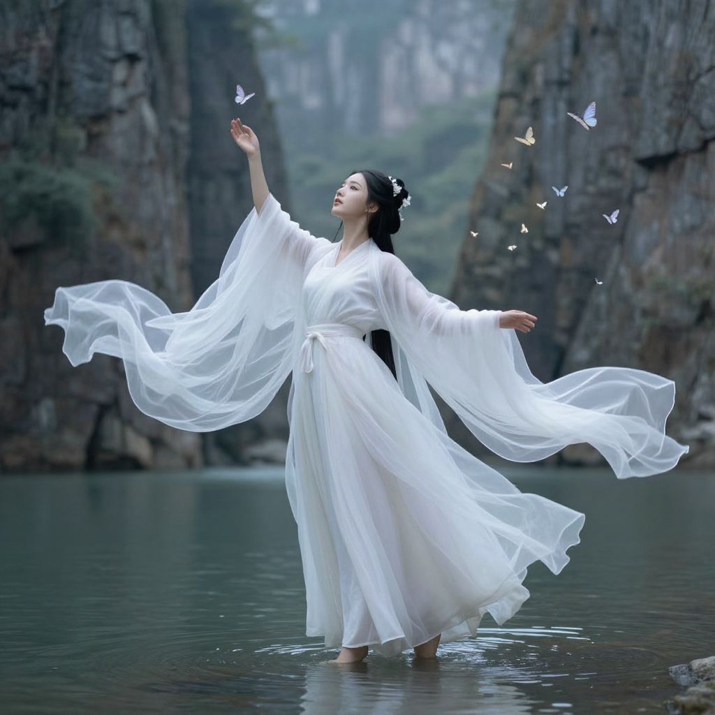 Photograph of an Asian woman with long black hair, wearing a flowing white dress with billowing sleeves, standing in a shallow river surrounded by tall, rocky cliffs. She is barefoot, with her right arm raised and left arm outstretched, as white butterflies flutter around her head. The background is misty, with green foliage at the cliff tops. The water is calm, reflecting the woman and butterflies. The image has a dreamy, ethereal quality, with soft lighting and a serene atmosphere.