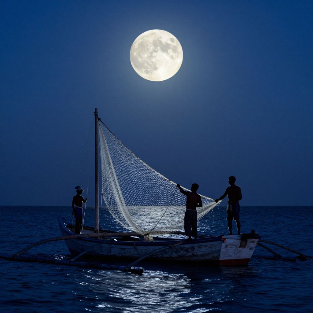 Photograph of silhouetted fishermen adjusting a net on a small boat under a bright full moon, against a deep blue ocean and sky.
