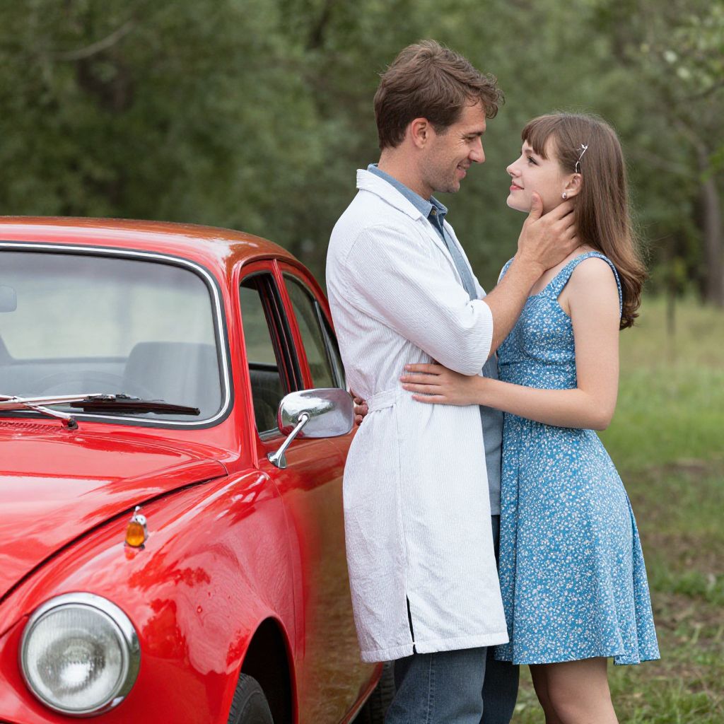 Photograph of a Caucasian couple standing beside a bright red classic car in a grassy, forested area. The man, with short brown hair, wears a white lab coat over a blue shirt and dark jeans. He has a light beard and smiles at the woman, who has long brown hair with bangs, wearing a sleeveless blue floral dress. She gazes up at him with a smile, her right hand gently touching his jaw. The car's shiny exterior reflects the greenery in the background. The mood is romantic and serene.