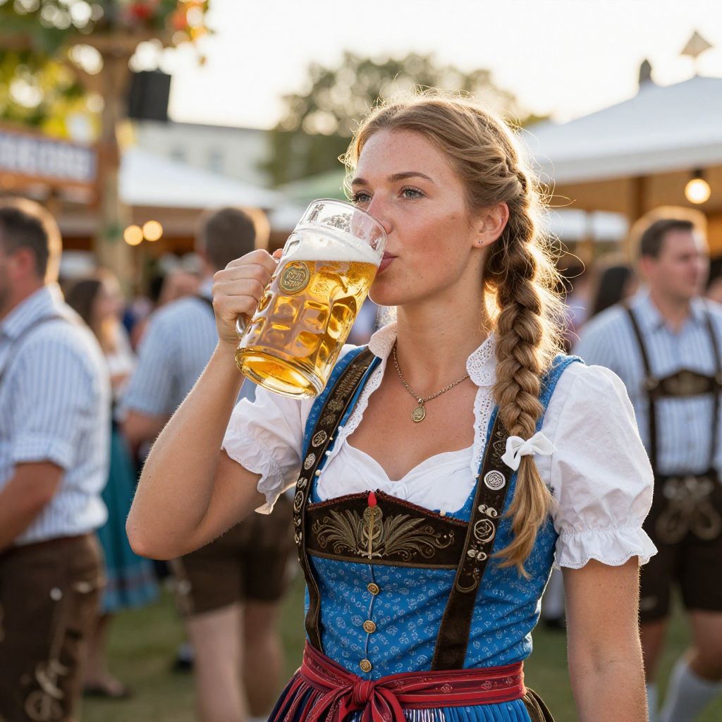Photograph: Blonde woman in traditional German dirndl drinking beer at outdoor Oktoberfest, surrounded by people in similar attire, soft evening light.