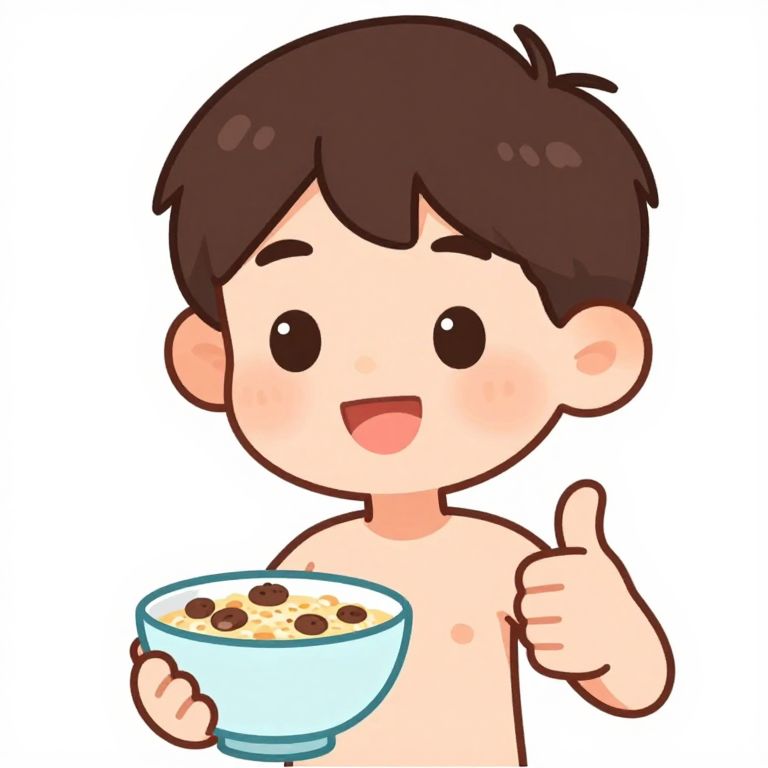 Illustration of a smiling skinny young boy with short brown hair holding a bowl of cereal with chocolate pieces, giving a thumbs-up gesture. The character is depicted with a cheerful expression and rosy cheeks on a white background.