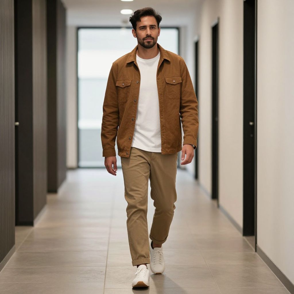 Nice Casual Man Outfit Costume, a man in a brown jacket and white shirt walking down a hallway