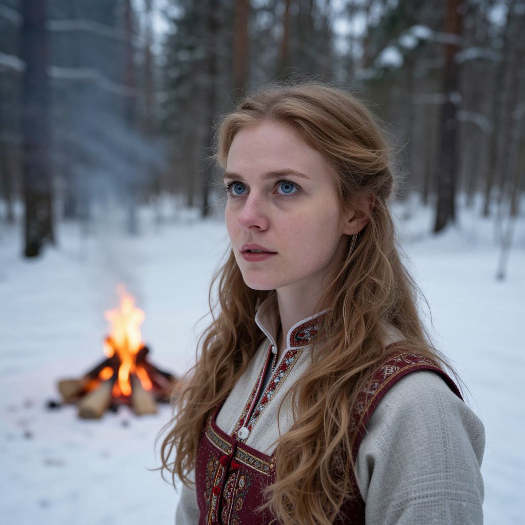Craft a hyperrealistic portrait of a European woman with vibrant blue eyes and cascading golden-brown hair, standing amidst a serene snow-covered forest. From an unconventional worm's-eye perspective, capture the interplay of soft shadows cast by the warm campfire in the distance, illuminating her expression and traditional attire. This captivating scene evokes a sense of tranquility mixed with anticipation as she appears deep in thought, contemplating the vast wintry landscape before her.