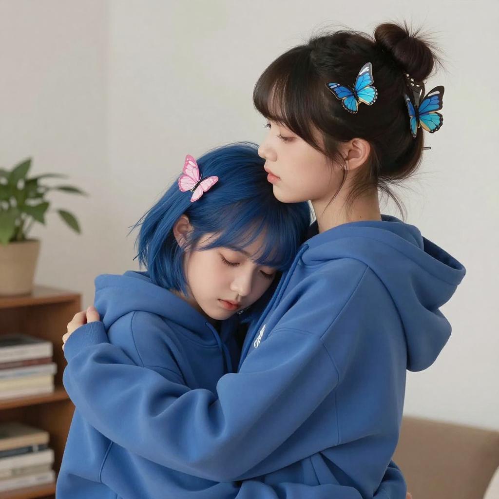 Digital artwork depicting two young women in an intimate embrace indoors, both wearing blue hoodies. One woman with dark hair styled in a bun adorned with blue butterfly hair clips is holding the other woman with short blue hair and a pink butterfly hair clip. The setting is a softly lit room featuring blurred background elements like a plant and books on a shelf.