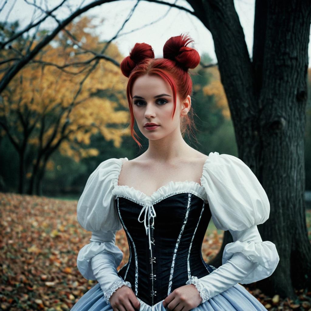 Portrait of a young woman with red hair styled in double buns, wearing a black corset dress with white puffy long sleeves. She is standing outdoors in a park-like setting during autumn, with fallen leaves and trees with yellow foliage in the background. The atmosphere is natural and slightly moody, with a shallow depth of field focusing on the subject.