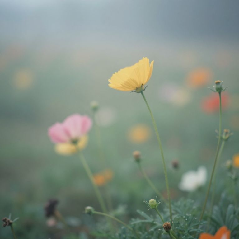 Amidst the ethereal haze, vibrant blooms whisper secrets of transience, their fleeting beauty a poignant reminder of life's impermanence and the quiet serenity found in nature's unspoken moments.