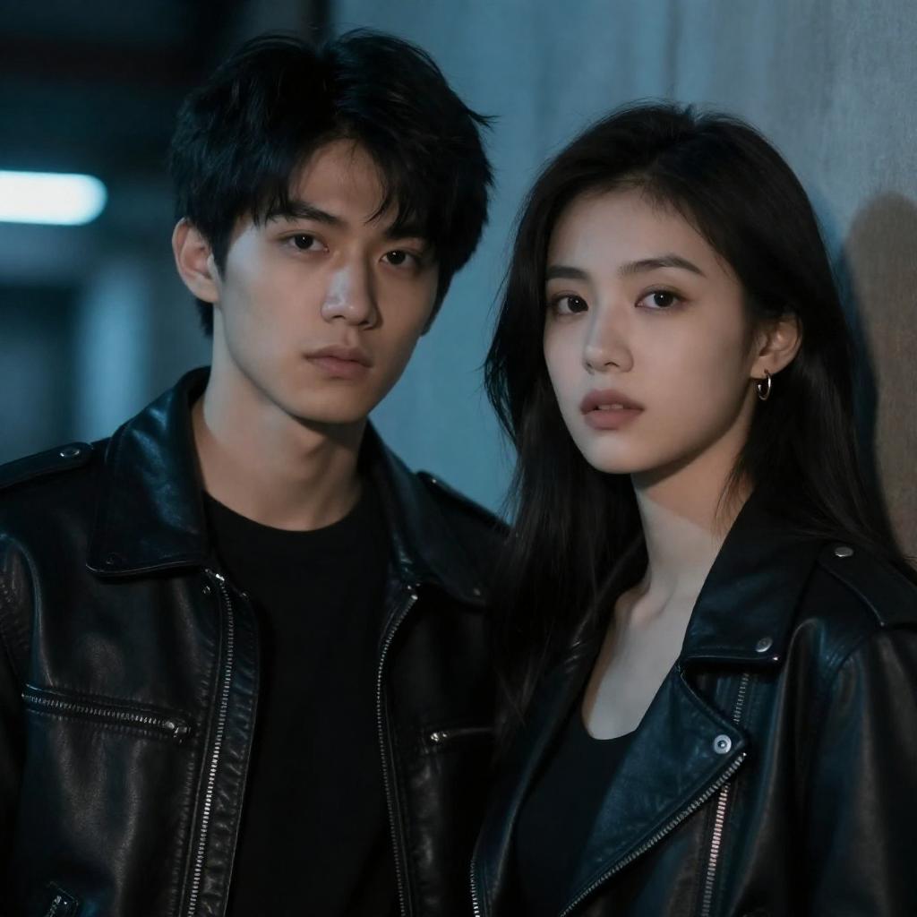 Photograph of two East Asian individuals in a dimly lit tunnel. The man in the foreground, with dark hair and a cigarette in his mouth, looks ahead. The woman with dark hair, behind him, leans on his shoulder, eyes closed. Green fluorescent light on the left, car headlights in the background. Tunnel walls are dark green.