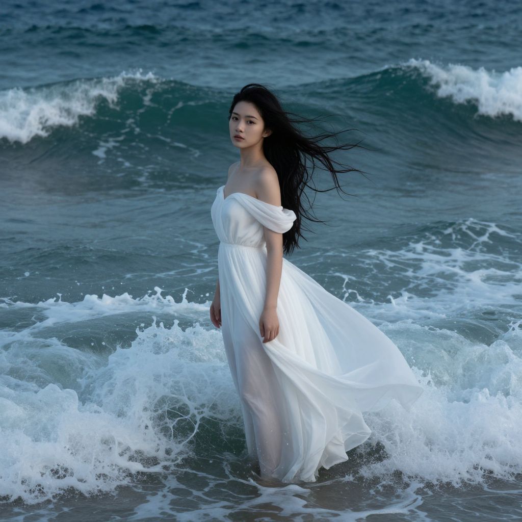 Photograph of an East Asian woman with long black hair, wearing a flowing white off-shoulder dress, standing in ocean waves.