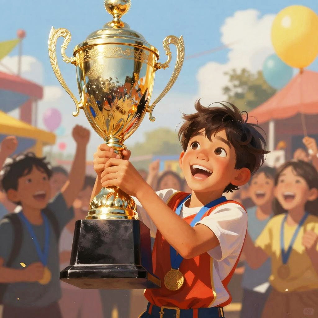 The strongest kid in the world holding a huge trophy, surrounded by cheering crowd, colorful festival atmosphere, bright and uplifting mood, digital painting with fine details