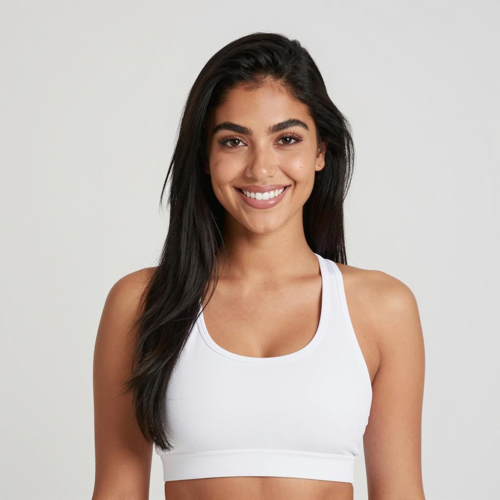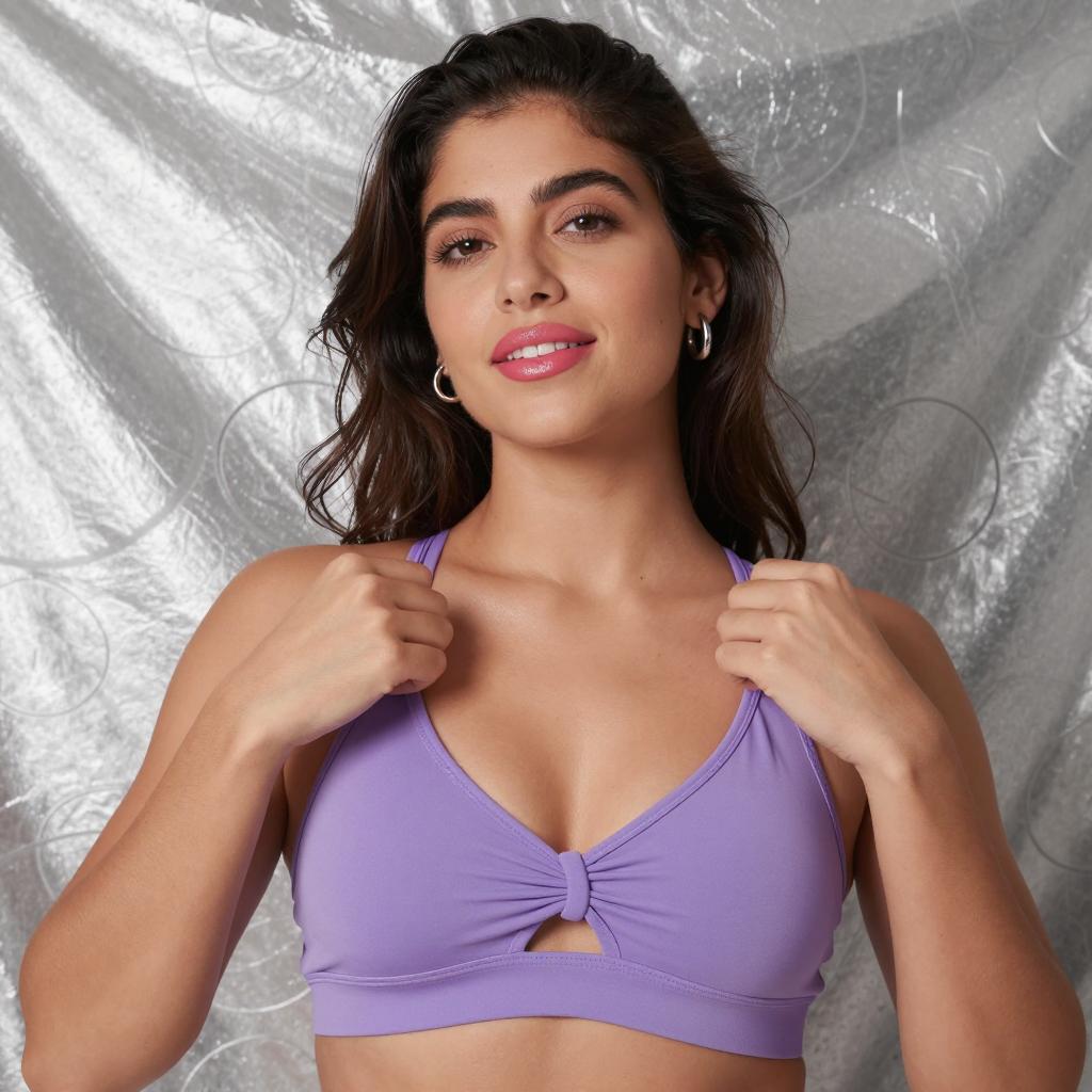 Photograph of a Latina woman with medium skin tone and dark brown hair. She wears a purple sports bra with a bow in the center, small silver hoop earrings, and has her hands near her collarbone. She has pink glossy lipstick and a slight smile. Background consists of a ured, reflective silver surface with circular patterns. Her head is tilted slightly back and to the left.