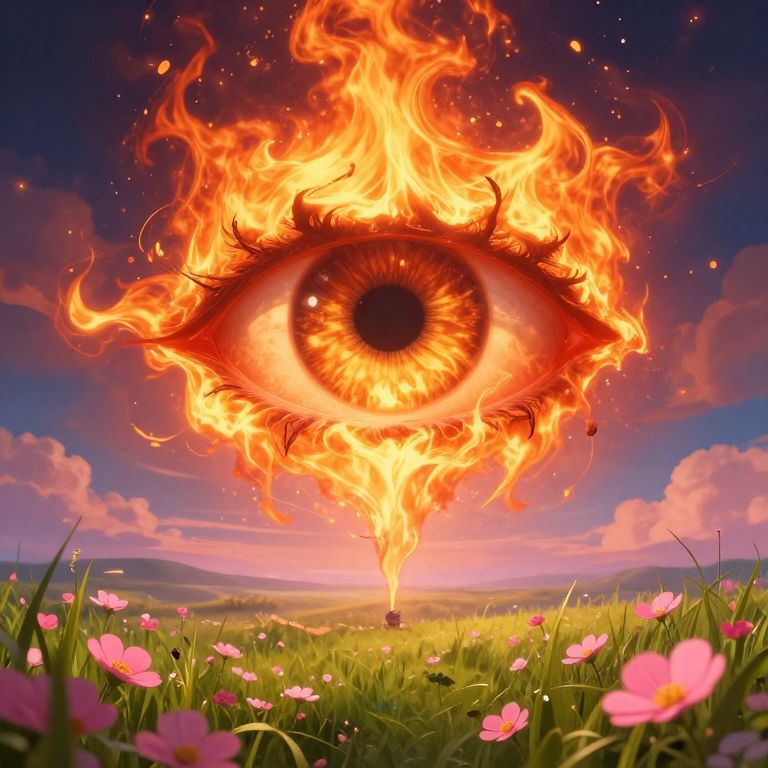 Giant flames radiate outward from a surreal, fiery eye in the sky, its pupil pulsing with a golden ember, as vibrant grass and delicate pink flowers whisper secrets beneath a dreamlike horizon.