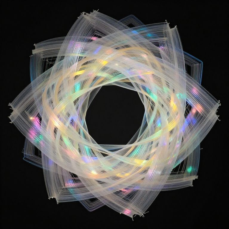 Chitin fibers weaving together in an abstract, geometric sculpture, semi-transparent layers with iridescent hues, ambient lighting, surreal art style blending nature and technology
