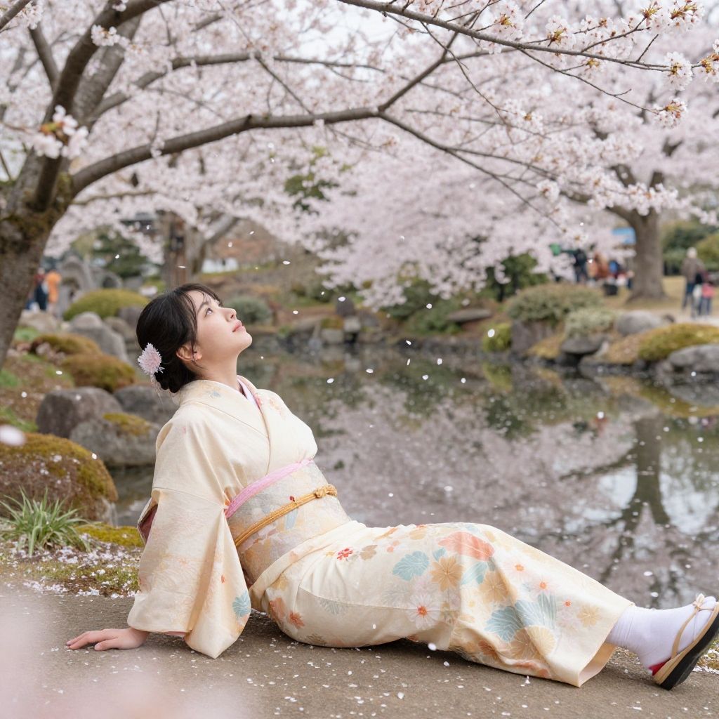 Photograph of an East Asian woman with fair skin and black hair, adorned with a pink flower, sitting on a stone path under blooming cherry blossoms. She wears a traditional white kimono with floral patterns and a yellow obi belt. Her head is tilted back, eyes closed in serene contentment. Cherry blossoms fall around her, and a tranquil pond with rocks and greenery is visible in the background. Blurred people can be seen in the distance. The overall scene is vibrant with soft, natural light highlighting the delicate pink blossoms and her peaceful expression.